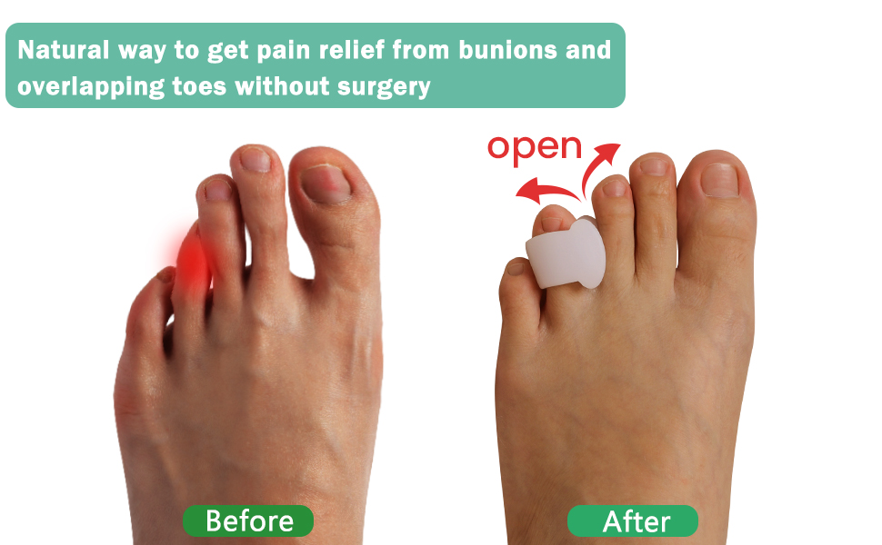 👣[سهل الاستخدام]: ضع حلقة مصحح إصبع القدم على إصبع قدمك الثاني. الدعم القوي لمصحح الورم الجل يحافظ على محاذاة إصبع القدم الكبير بشكل صحيح، مما يمنعه من التداخل أو الاحتكاك بإصبع القدم الثاني، مما يقلل الضغط الناتج عن الأورام.