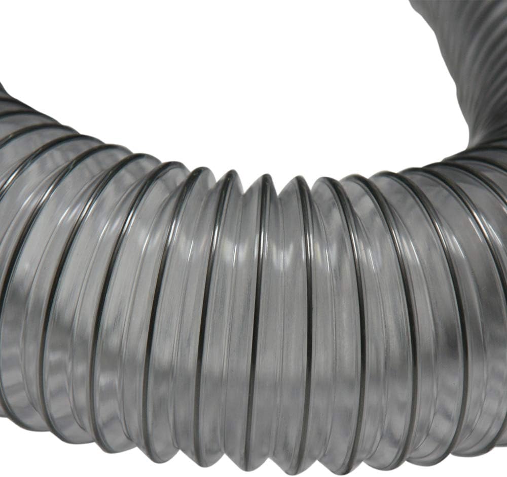 The "PVC Flexduct Light-Duty Clear" is a medium-weight clear PVC flexible hose reinforced with a spring steel wire helix for industrial air movement and fume control applications. These commercial flexible hoses provide great flexibility with tight bending characteristics and offer good chemical and dampness resistance. This flex ductwork is great for applications where ventilation and flexibility are a must. PVC hose material is an amorphous polymer and as a result its basically transparent. PVC flex hoses are non-transparent when they are manufactured using compounding agents. Since the main chain of the polymer is made by single bonds of carbon atoms, PVC has excellent chemical resistance. The "PVC Flexduct Light-Duty Clear" light-duty flex hose has a working temperature range from -20 to 160+ Fahrenheit. These commercial hoses are manufactured with FDA acceptable materials that can be used in food processing, pharmaceutical, and health care applications. PVC has polar groups (chlorine), and is amorphous, therefore mixes well with various other substances. This makes for a chemically stable flex duct. This flexible hose exhibits excellent flexibility and compressibility. In larger ID sizes it has up to a 6 to 1 compression ratio, meaning a 12 foot length can compress down to 2 feet. In addition the smaller sizes of this hose (2.25" and below) can handle a full vacuum at 29 Inch/Hg. Please refer to the product specification guide for exact information regarding the ID size you are considering. The "PVC Flexduct Light-Duty Clear" are general-purpose collections ducts that are available in internal diameter sizes from 1.25" up to 24" ID. These are also available in metric sizes. These air, dust and light material collection ducts are available in clear in standard 12.5 ft and 25 ft sections and come with plain cut ends.