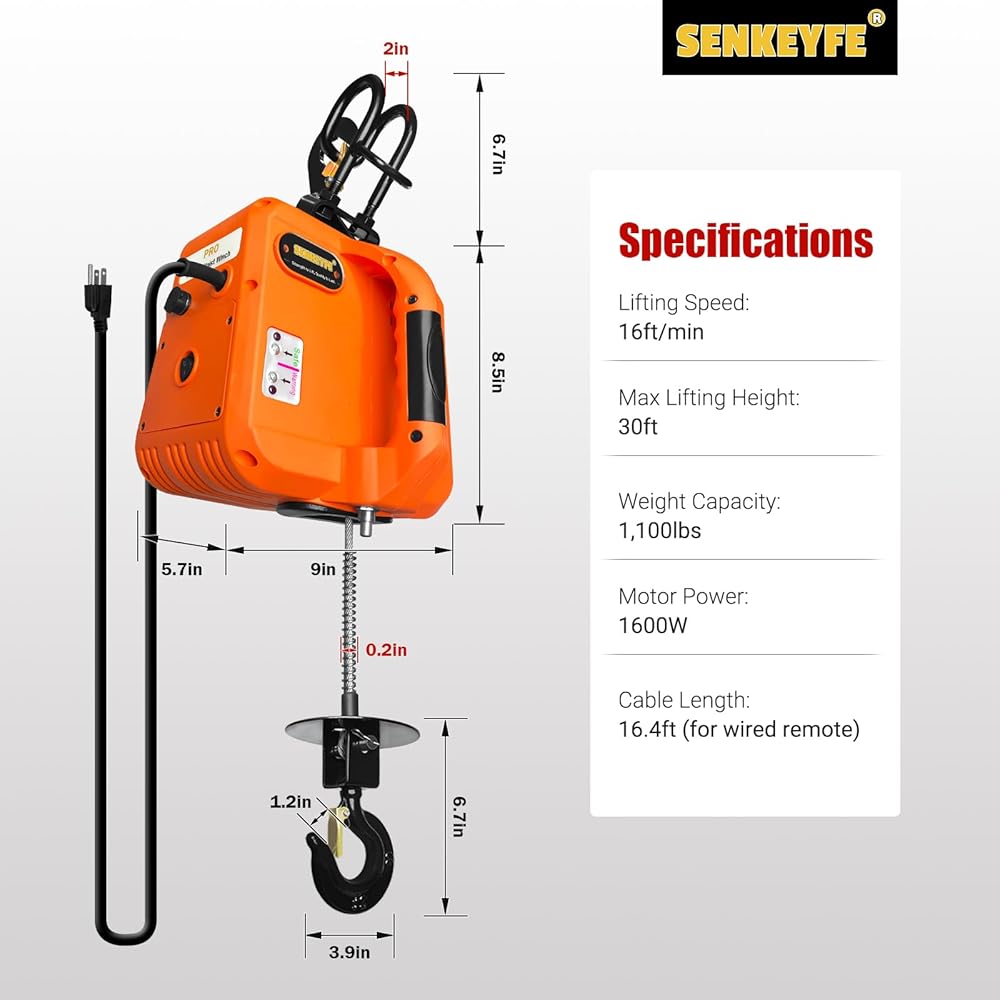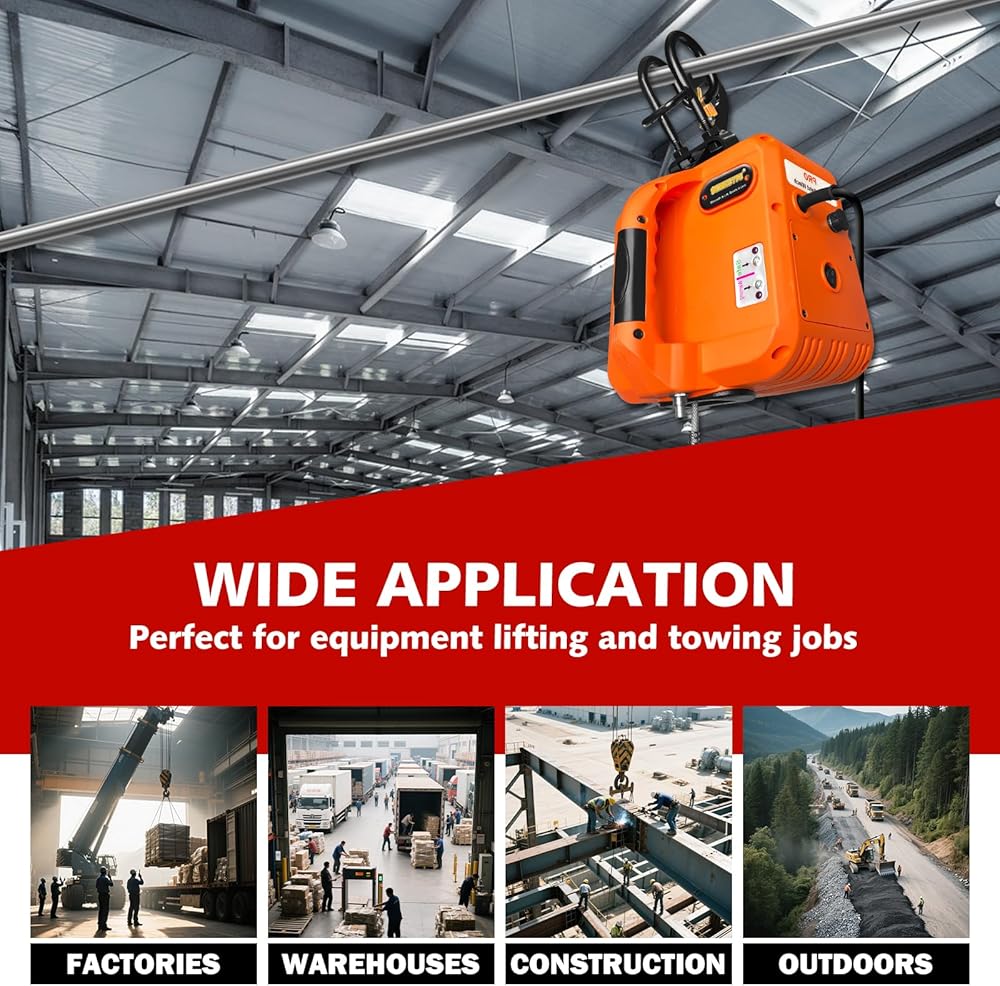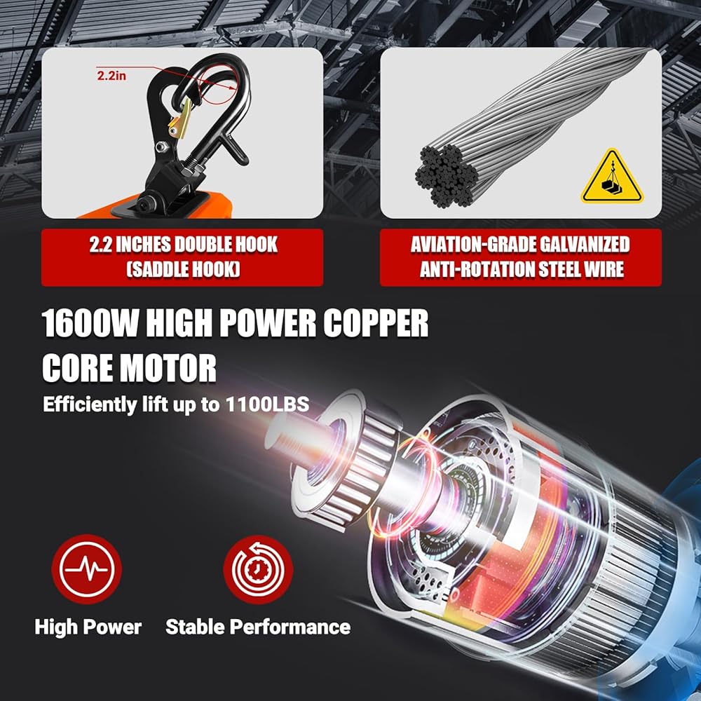 【الحمل المقدر بـ 1100 رطل】: مصمم بقدرة رفع تصل إلى 1100 رطل، والحمل المقدر بـ 1100 رطل؛ ومزود بمحرك نحاسي عالي الطاقة بقدرة 1500 واط، يتميز بحجم صغير، طاقة عالية، إنتاج حرارة منخفض، ضوضاء منخفضة، أداء مستقر، مما يوفر توازن القوة يوفر الوقت ويزيد الإنتاجية