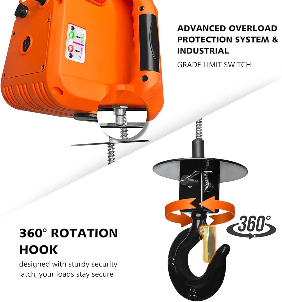 【تصميم محسّن】: الونش الكهربائي الخاص بنا مصمم بسلك فولاذي مجلفن مضاد للدوران بدرجة الطيران، ناعم ومتانة جيدة ومقاوم للتآكل. الخطافات مصنوعة من الفولاذ المطروق عالي القوة، مع دوران 360 درجة ومزلاج أمان قوي، تبقى حمولاتك آمنة. وتم تصميمه باستخدام نظام حماية متقدم من التحميل الزائد ومفتاح حد من الدرجة الصناعية