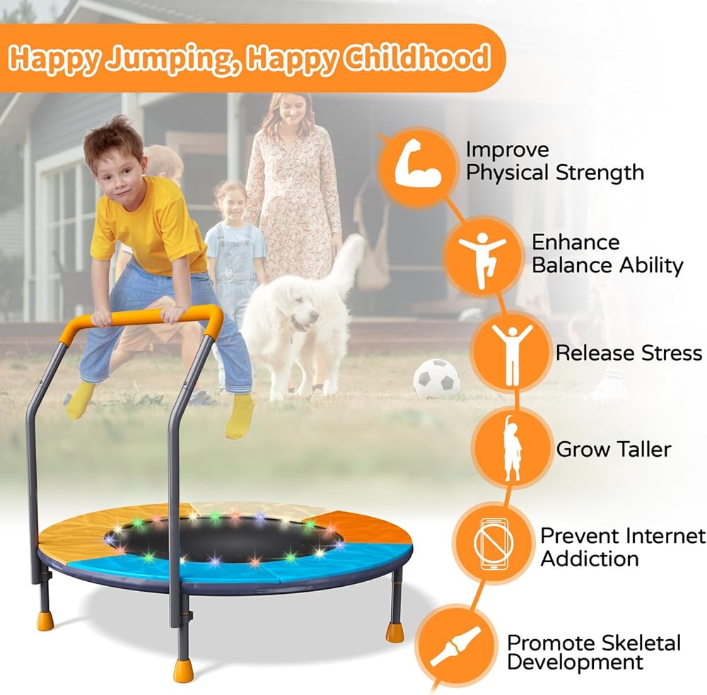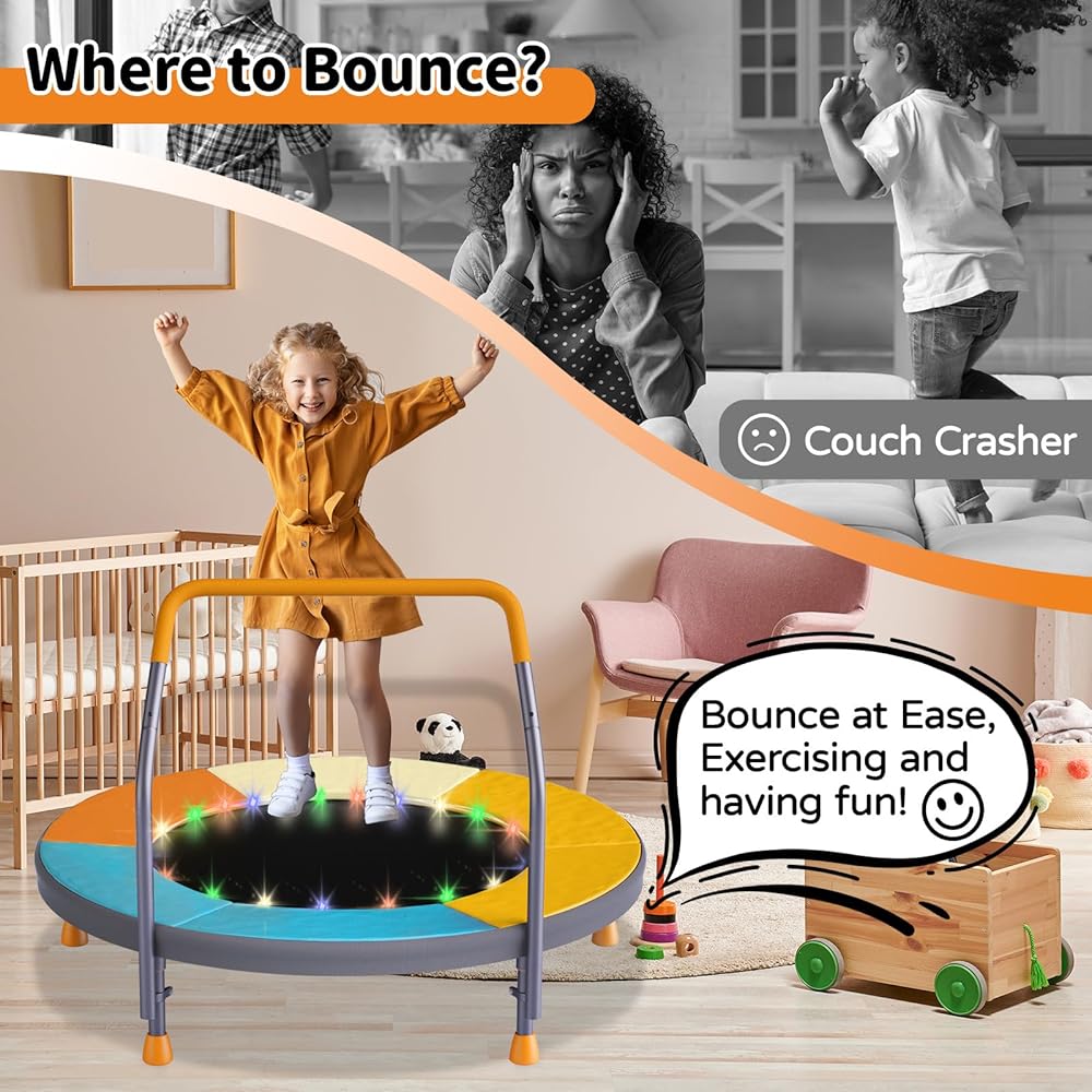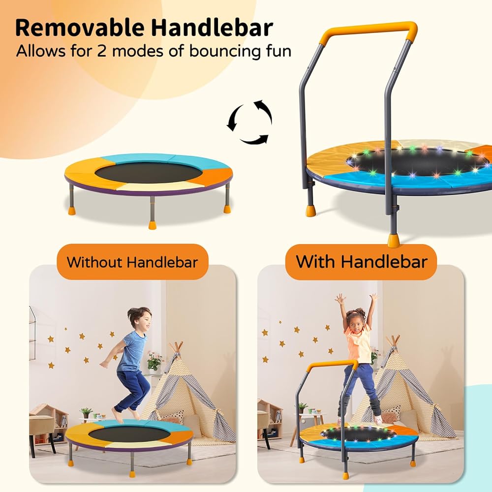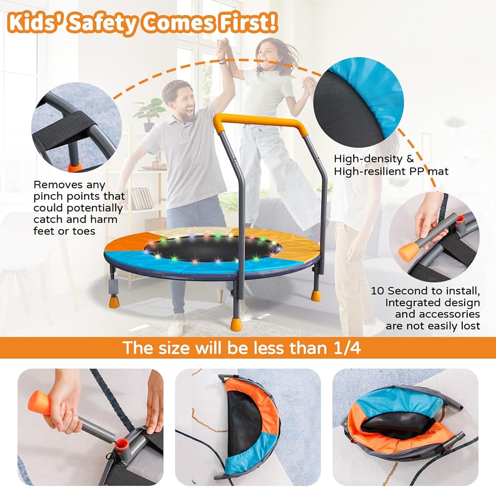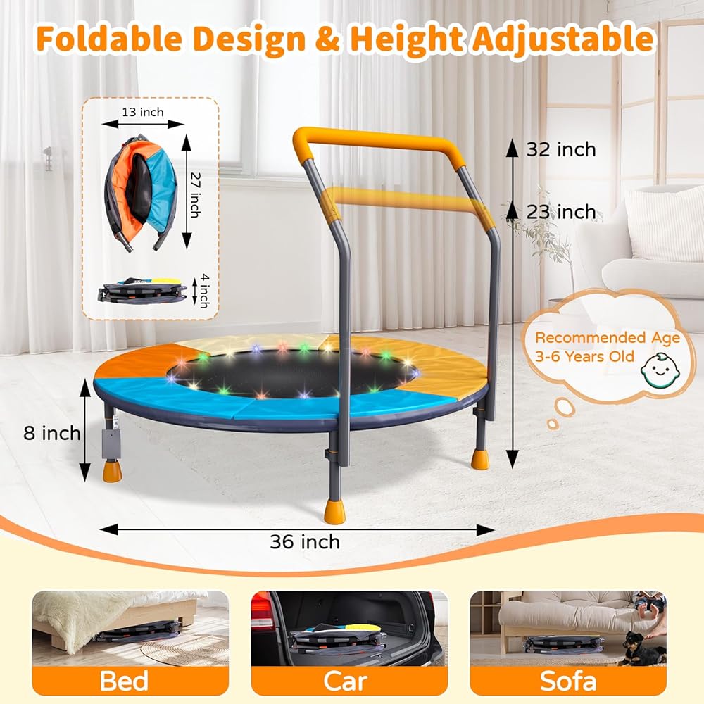 ترامبولين قابل للطي بطول 3أقدام للأطفال، ترامبولين صغير مقاس 91.44 سم مع إضاءة LED وموسيقى، ترامبولين ترفيهي للياقة البدنية في الأماكن المغلقة والخارجية مع مقود، بساط قفز للأطفال الصغار قابل لضبط الارتفاع، بحد أقصى 150 رطل
