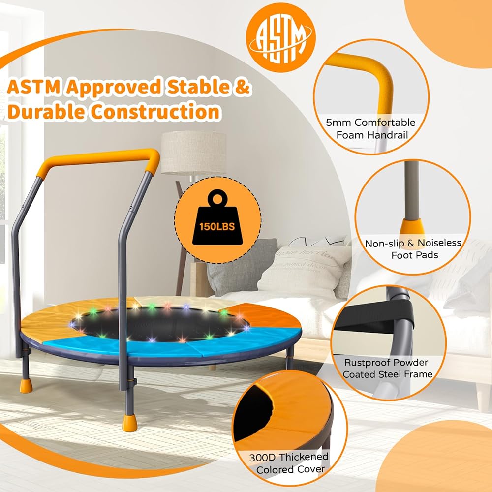 • 【مقبض قابل للإزالة وتصميم خالٍ من الزنبرك】لديك خياران لتثبيت المقبض. يمكنك فصله بسهولة عندما لا يكون ذلك مطلوبًا. لضمان سلامة وتوازن الأطفال أثناء القفز، يأتي الترامبولين الخاص بنا مزودًا بمقبض موثوق مغطى بمادة إسفنجية متينة. مجهزة بغطاء أمان قوي يحمي أطفالك من السقوط المحتمل على السطح الفولاذي الصلب. لا يضمن سلامة الأطفال الصغار فحسب، بل إنه أيضًا لا يصدر ضوضاء، مما يمنع أي ضوضاء مزعجة
