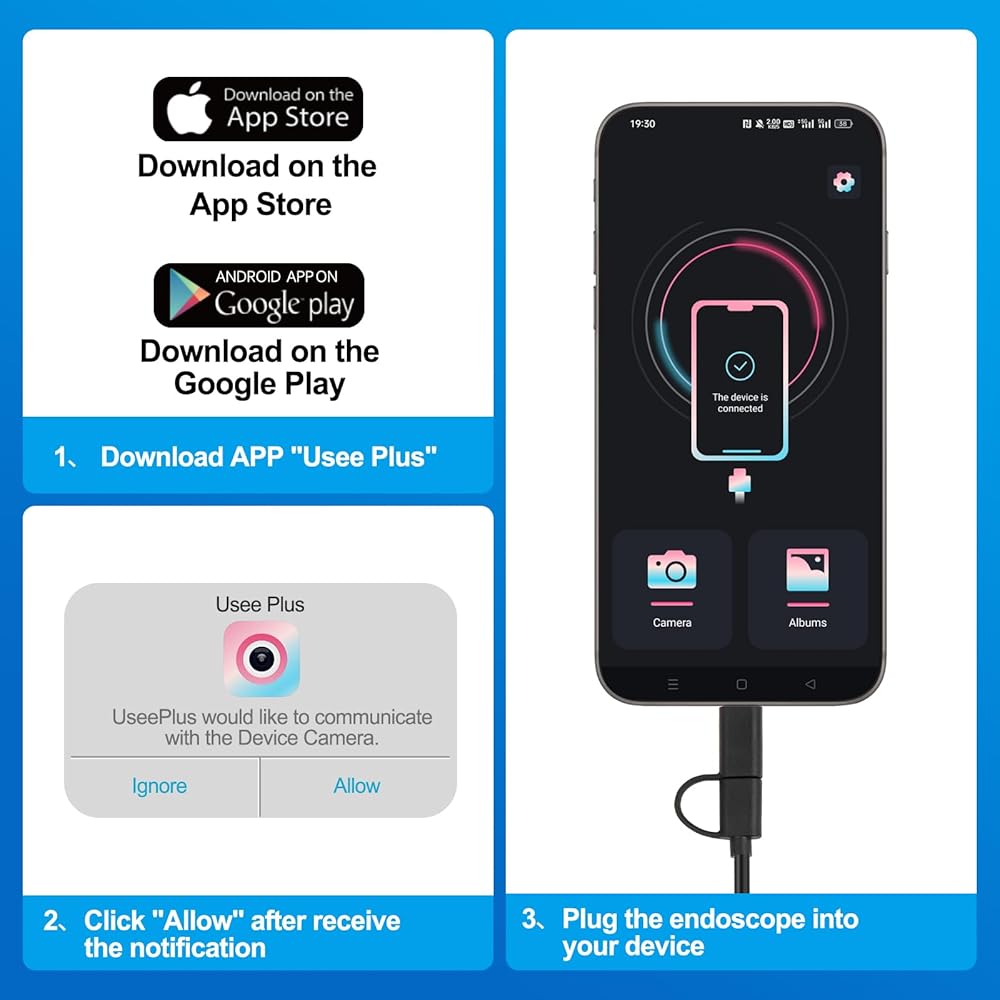 • توافق واسع: مصمم بمنافذ طراز Type-C وLightning، يمكن لهذا المنظار الاتصال بأجهزة نظام Android 6.0+ وIOS 9.0+. قم بتنزيل التطبيق "Usee Plus" من "متجر تطبيقات Apple" أو "Google Play" أو قم بمسح رمز الاستجابة السريعة في دليل المستخدم وتثبيته. يدعم التطبيق سهل الاستخدام لكاميرا borescope المزودة بالضوء سهولة عرض الصور ومقاطع الفيديو وتسجيلها ومشاركتها عبر منصات متعددة