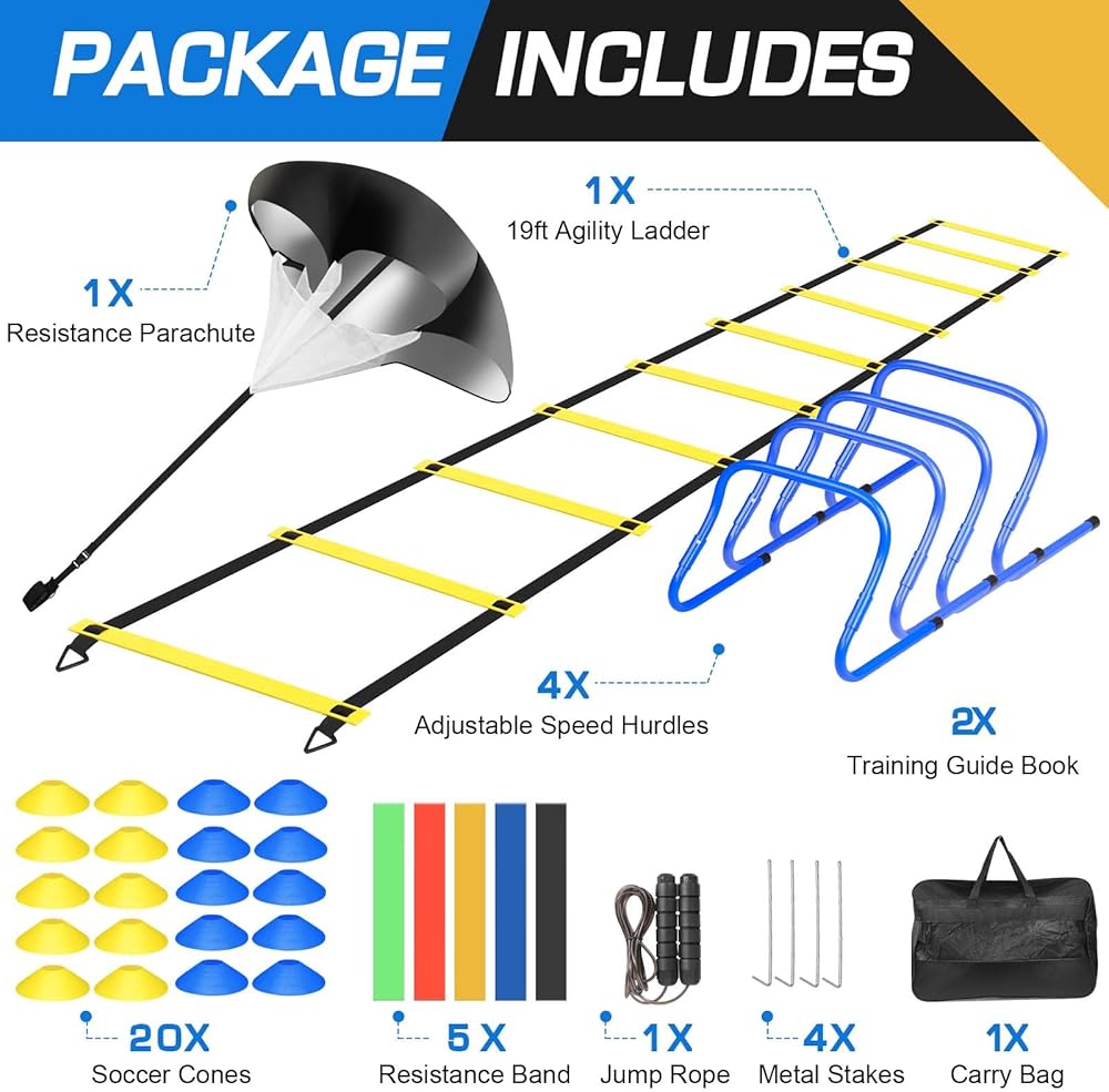 مجموعة معدات تدريب كرة القدم من سلم الرشاقة، سلم سرعة 20 قدمًا و12 درجة، 4 حواجز، 20 مخروطًا، 5 أشرطة مقاومة، مظلة، حبل القفز مع حقيبة حمل للتدريب السريع على كرة القدم
