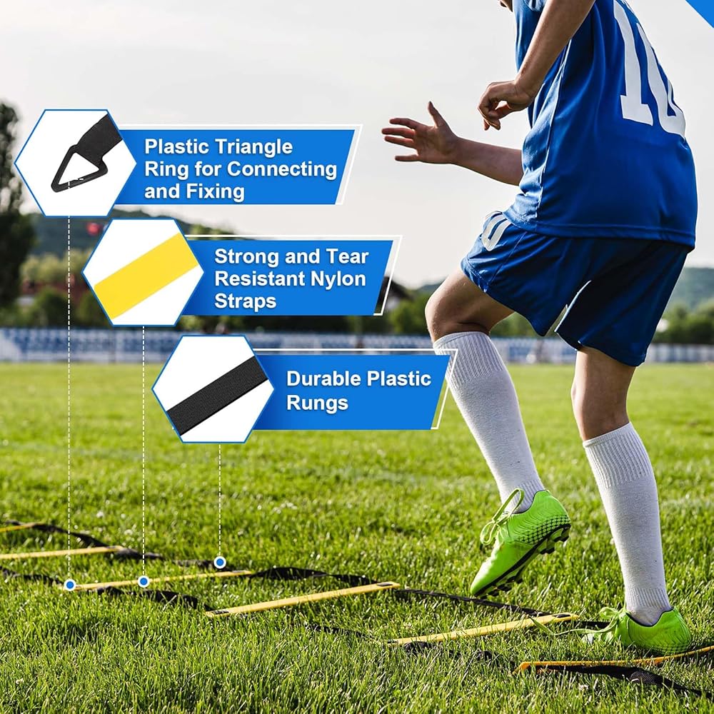 【سلم رشاقة ذو 12 درجة】سلم السرعة بطول 20 قدمًا قابل للتعديل، مما يسمح لك بتخصيص المسافة بين كل درجة للتدريب المخصص. هذه الميزة تجعلها مثالية للتمارين المتنوعة، والتكيف مع مستوى مهارة الرياضيين المختلفين، وتعزيز دقة حركة القدم.