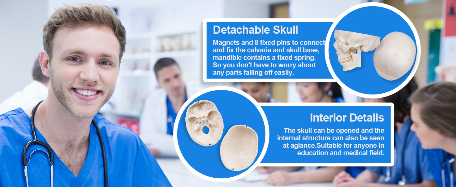 Detachable Design:The skull anatomy model can be disassembled into 3 parts: Calvaria,Base of Skull and Mandible.Calvaria,Base of Skull are fixed magnetically.the mandible contains a fixed spring.At the same time,our human skull model has three lower teeth that can be removed and three additional teeth for replacement.This will give you a better view of the structure of the human skull.