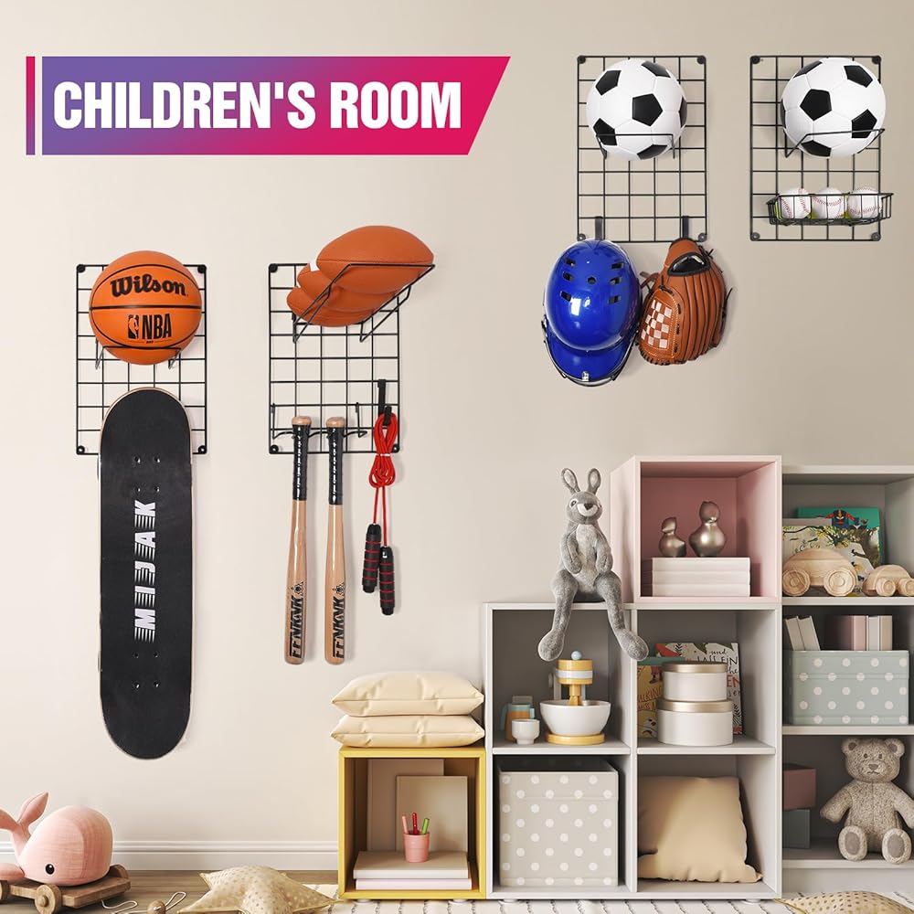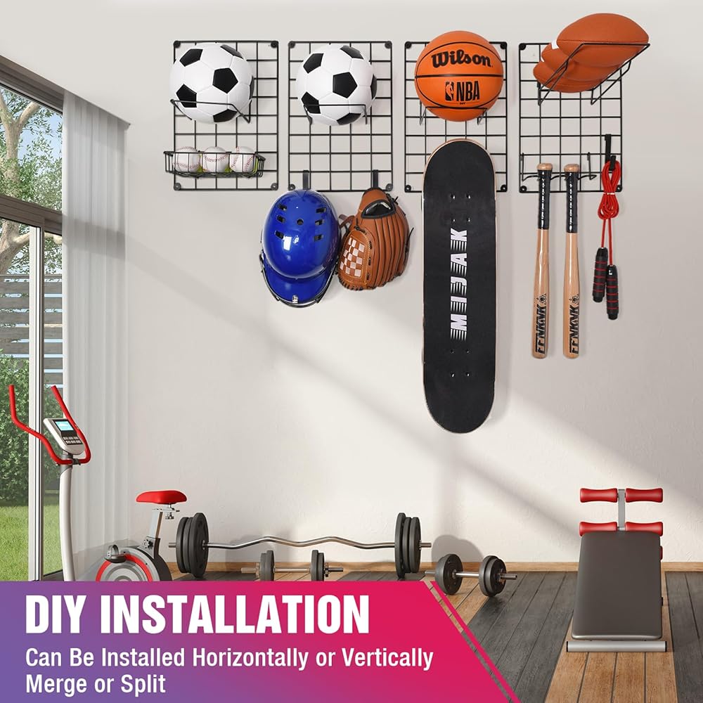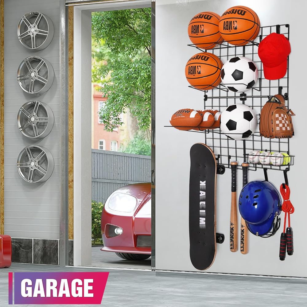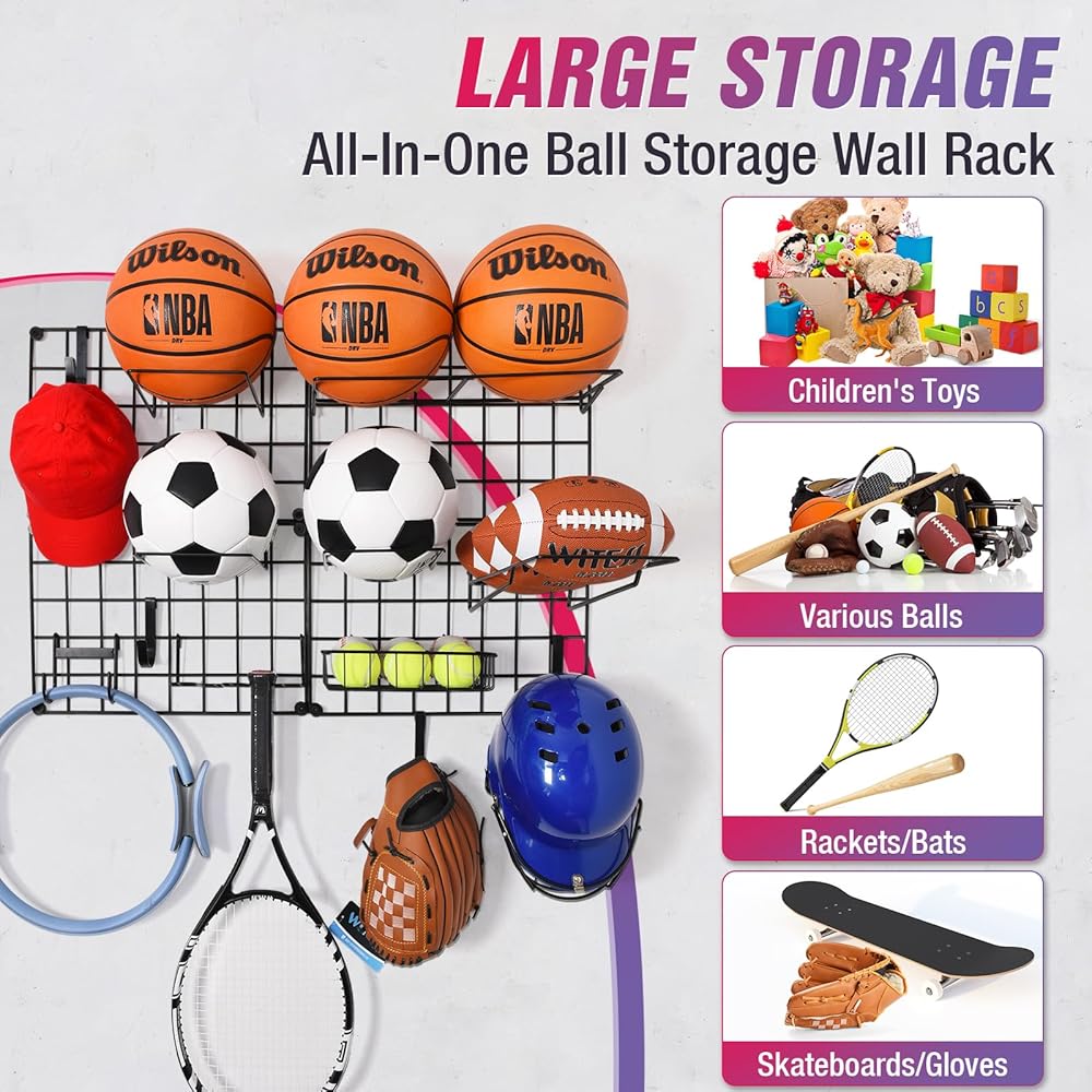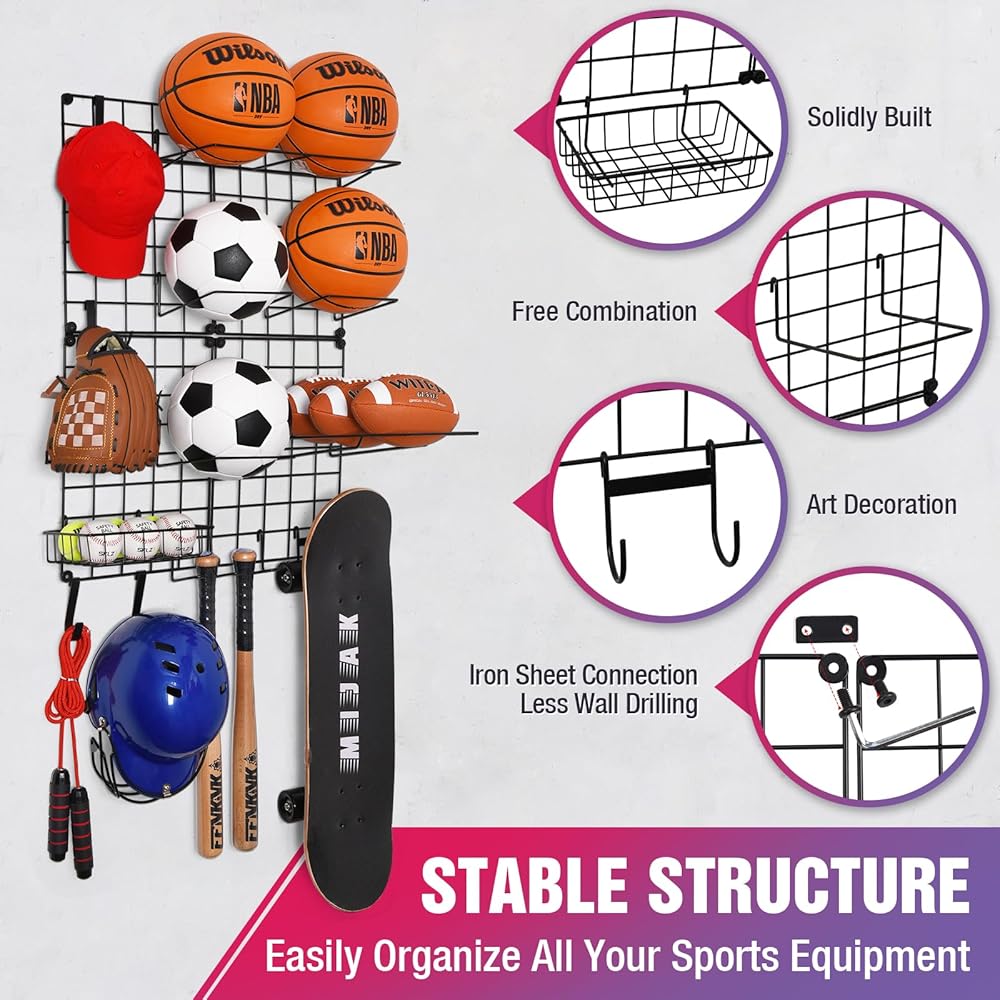 🏀【منظم حائط جراج متعدد الوظائف】مثالي لتنظيم جميع أنواع المعدات الرياضية. يأتي رف تخزين الكرة مع 4 × شبكة خلفية معدنية، و5 × إطار كرة، و1 × سلة ومجموعة متنوعة من الخطافات. يمكنه حمل كرات السلة وكرة القدم وكرة القدم. الكرات، البيسبول، الكرات الطائرة، التنس، الخوذ، القفازات، لوح التزلج، مضرب البيسبول، مضارب التنس وحتى تخزين ألعاب أطفالك ومستلزمات الشاطئ.