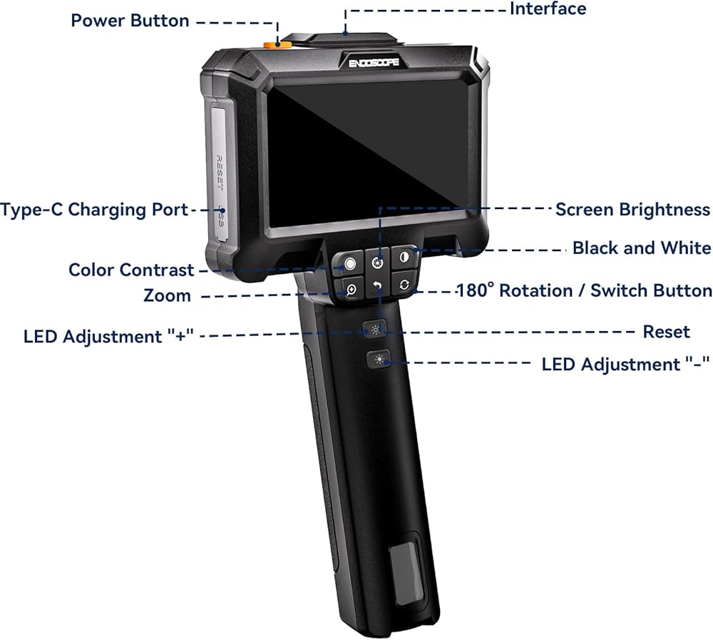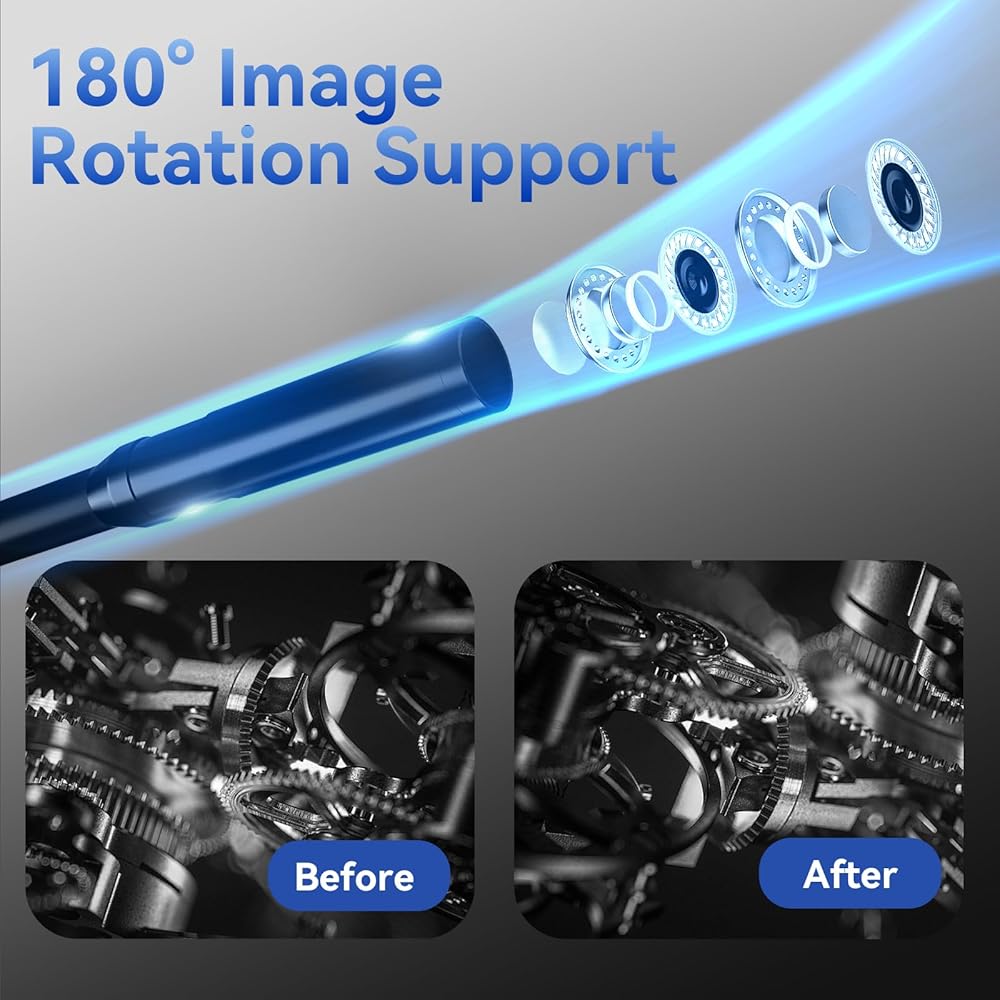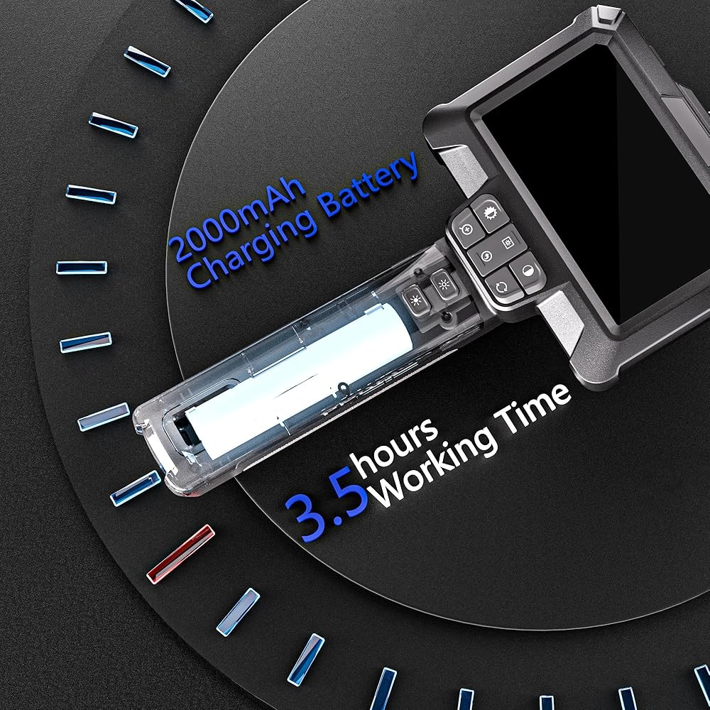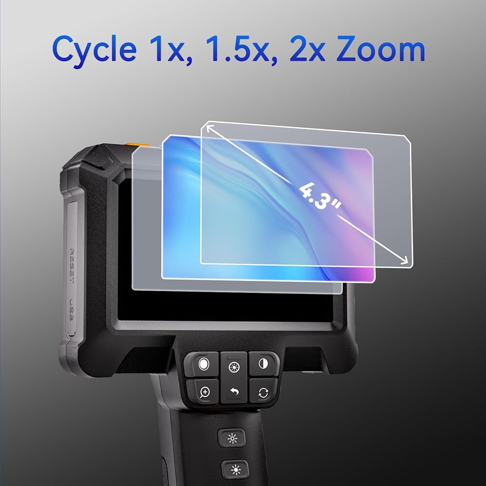 شاشة IPS مقاس 4.3 بوصة ودوران الصورة بزاوية 180 درجة: تتيح شاشة LCD الملونة مقاس 4.3 بوصة عرض الصور عالية الوضوح في الوقت الفعلي. ويضيف زر الدوران بزاوية 180 درجة المرونة لفحص الأشياء من زوايا مختلفة. ملاحظة: لا تدعم كاميرا المنظار هذه التقاط الصور أو مقاطع الفيديو.