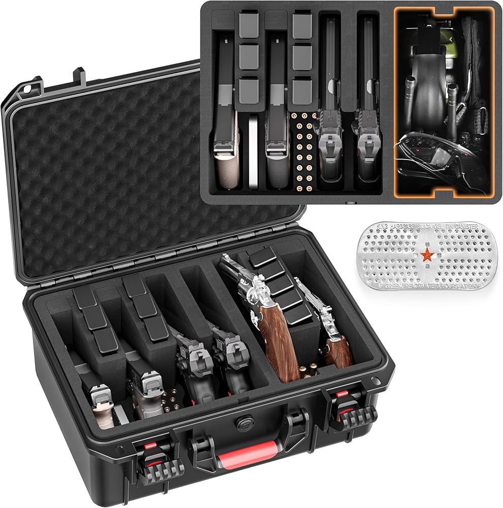 • 【تصميم مخصص】تم تصميم حقيبة المسدس الصلبة هذه لتناسب 5 مسدسات و12 مجلة. تضمن الحشوة الإسفنجية المصنوعة بعناية تخزين الأسلحة النارية والمجلات الخاصة بك بأمان. يناسب معظم موديلات المسدسات المتوفرة في السوق بطول وحجم أقل من 11 بوصة، بما في ذلك Glock وSig Sauer والمزيد.