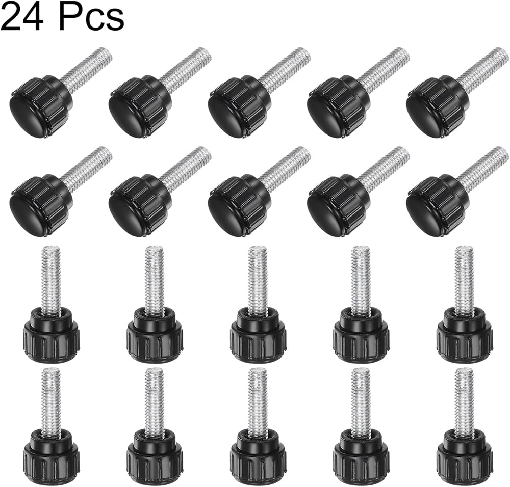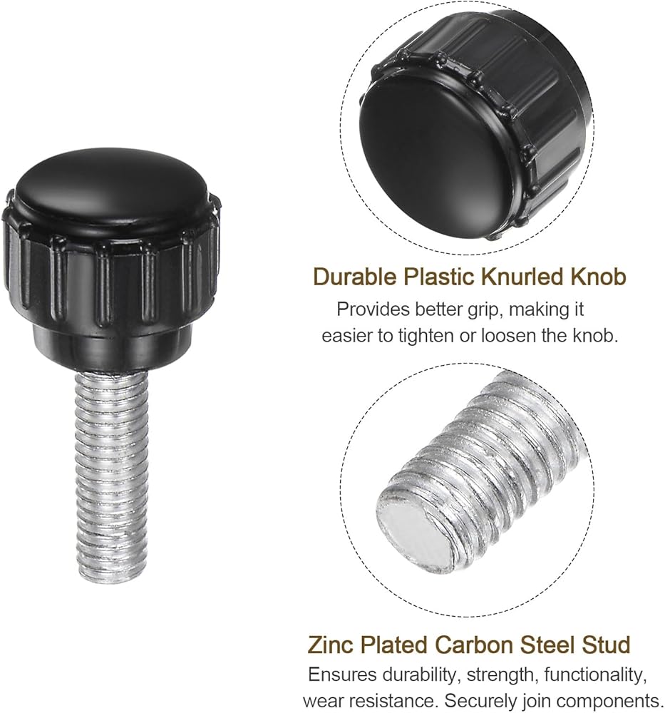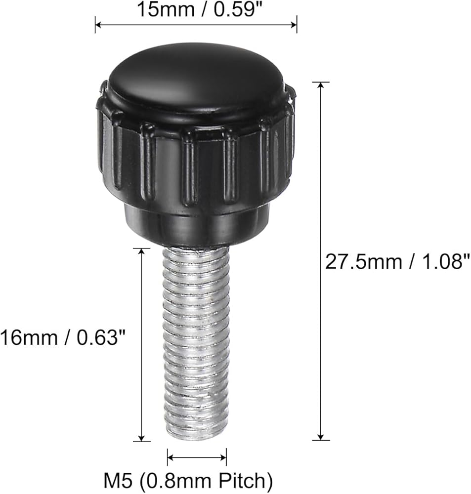 مقابض التثبيت المخرشة: حجم الخيط: M5 (درجة 0.8 مم)؛ طول الخيط: 16 مم / 0.63 بوصة؛ قطر الرأس المستدير: 15 مم / 0.59 بوصة؛ الطول الإجمالي: 27.5 ملم / 1.08 بوصة. براغي إبهام مخرشة آمنة ومأمونة للحصول على أقصى درجات التحكم في الضبط والشد.