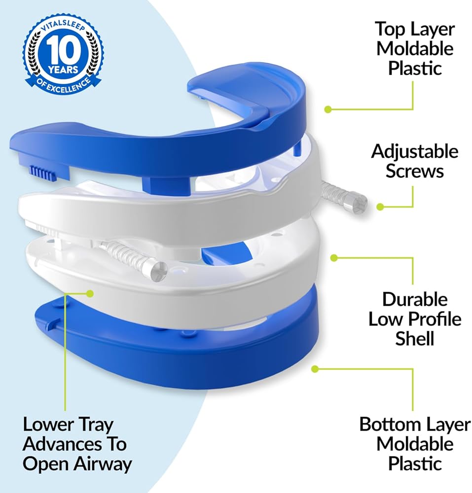 • نظام تعديل حاصل على براءة اختراع: يتميز جهاز تقدم الفك السفلي VitalSleep بدرج سفلي حاصل على براءة اختراع مع آلية قابلة للتعديل، مما يتيح لك تقديم الفك بما يصل إلى 8 مم للمساعدة في توسيع مجرى الهواء وفقًا لشدة الشخير. إنه يوفر ملاءمة شخصية ومريحة من خلال انطباعات الأسنان المخصصة، ويتم تحقيق ذلك من خلال عملية تركيب سهلة للغليان والعض في المنزل، مما يضمن نومًا هادئًا وخاليًا من الشخير أثناء الليل. قد لا يكون VitalSleep مناسبًا أو مناسبًا لجميع المستخدمين.
