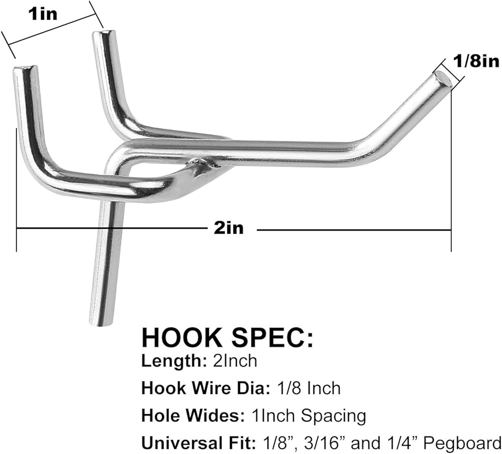 مواصفات خطافات PEG: طول الخطاف: 2 بوصة؛ العرض: 1 بوصة؛ ضياء السلك: 1/8 بوصة؛ تتضمن العبوة 100 قطعة خطافًا