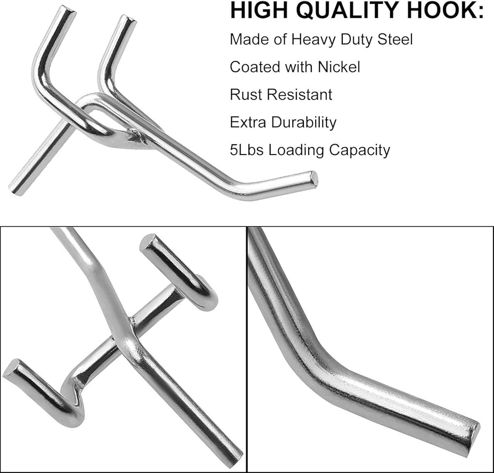 هيكل عالي التحمل: 100 قطعة خطافات بيجبورد مصنوعة من الفولاذ الصلب ومطلية بالنيكل لمقاومة الصدأ ومتانة إضافية؛ كل خطاف معدني يمكنه حمل ما يصل إلى 5 أرطال