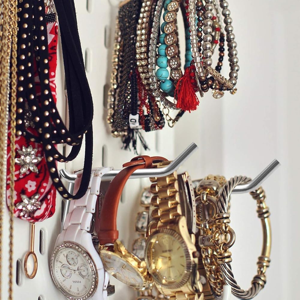قم بتنظيم المرآب أو Slatwall الخاص بك: تعتبر الخطافات المعدنية العالمية مثالية لتخزين أو عرض العناصر الخاصة بك، مثل أدوات التعليق واللوازم الحرفية وعرض المجوهرات، أو حتى عناصر البيع بالتجزئة