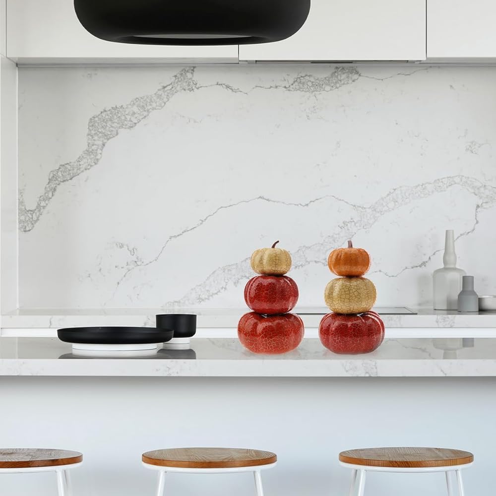 تصميم خاص مكدس من برج اليقطين، يبدو السطح أكثر سطوعًا وحيوية، كل يقطينة صناعية لها منحنى سيقان واقعية وتخرج من قممها، مما يجعلها تبدو وكأنها تم قطفها حديثًا من الكرمة.
