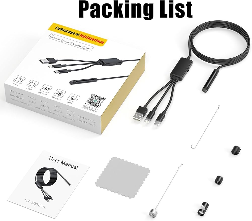 • [توافق عالي 3 في 1]: يأتي المنظار مع واجهة إمداد الطاقة بمحول Type-C، Micro، Lightning 3 في 1، تعمل كاميرا borescope هذه مع Android/Windows وiPhone مع نظام IOS 10+. يمكن أن يكون متوافقًا مع معظم الهواتف المحمولة وأجهزة الكمبيوتر الموجودة في السوق، مما يجعل استخدامك أكثر ملاءمة.