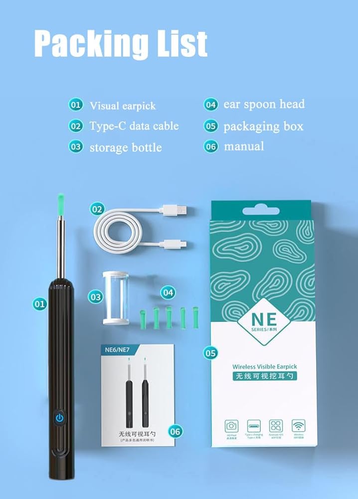 • تشتمل مجموعة إزالة شمع الأذن على: 1 × 1080P HD أداة كاميرا لإزالة شمع الأذن، 6 × أكمام أذن من السيليكون، 1 × زجاجة تخزين لأكمام الأذن من السيليكون، 8 × مجموعات العناية اليومية بالأذن، 1 × كابل شحن، 1 × دليل المستخدم.