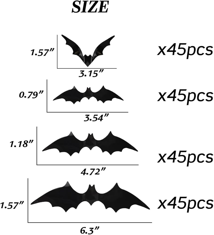 تشمل العبوة: يوجد 180 قطعة من الخفافيش السوداء المخيفة في مجموعة الخفافيش المزخرفة للهالوين. تحتوي على 4 مقاسات (تقريبيًا: 6.3 بوصة × 1.57 بوصة؛ 4.72 بوصة × 1.18 بوصة؛ 3.54 بوصة × 0.79 بوصة؛ 3.15 بوصة × 1.57 بوصة). يتم تضمين وسادات لاصقة على الوجهين في العبوة أيضًا.