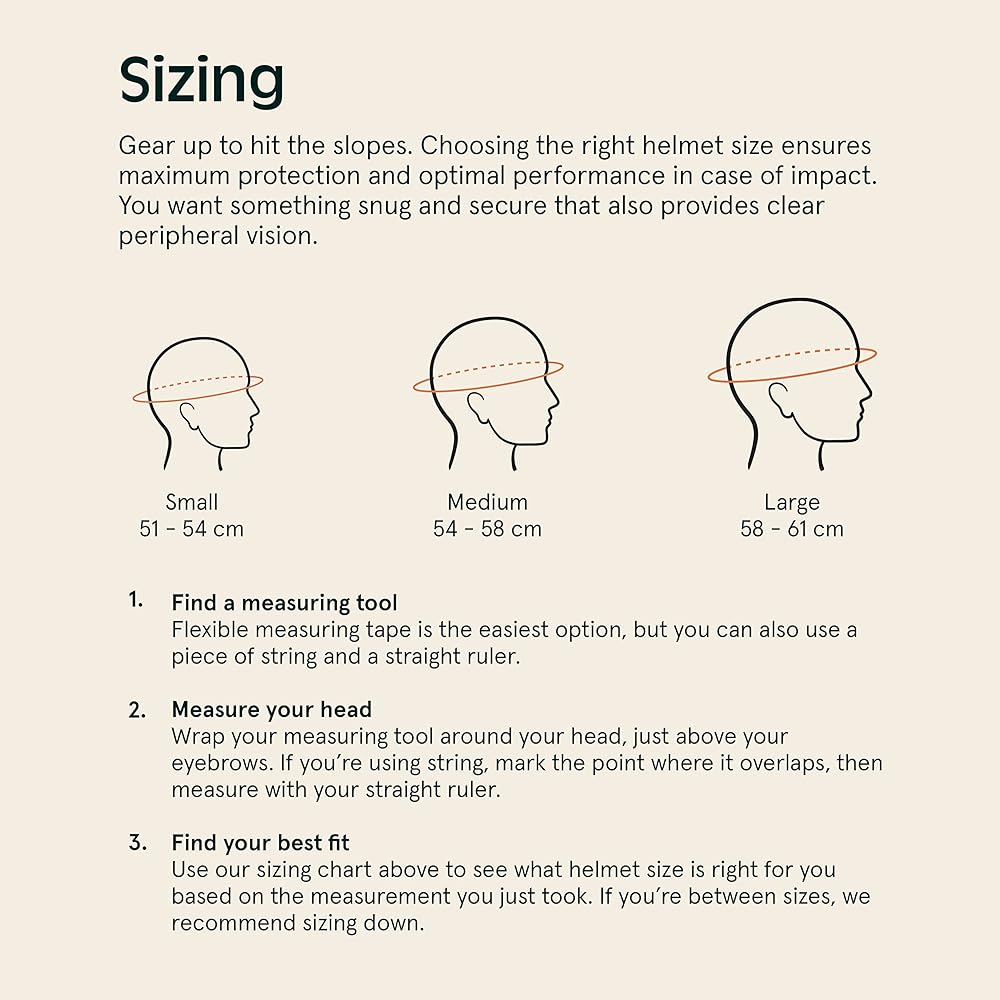 إرشادات المقاس - لتحديد المقاس الصحيح لخوذة التزلج للبالغين أو خوذة التزلج للشباب، قم بلف شريط قياس حول رأسك. يجب أن يستقر الشريط فوق أذنيك مباشرةً ويظل مستويًا حول محيط رأسك. صغير: 52-55 سم، وسط: 55-58 سم، كبير: 59-62 سم