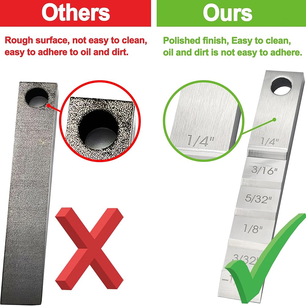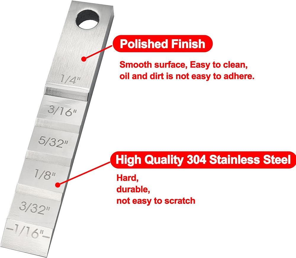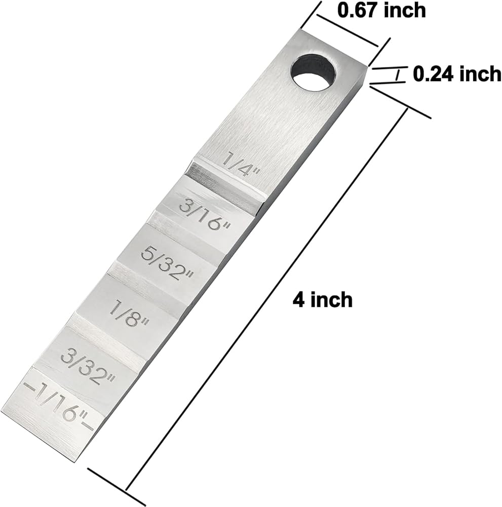 • الخطوات هي 1/16 بوصة، 3/32 بوصة، 1/8 بوصة، 5/32 بوصة، 3/16 بوصة، 1/4 بوصة. يمكن استخدام ألواح إسفين الحافة ذات الأبعاد المنحوتة كمقاييس وألواح إسفينية.
