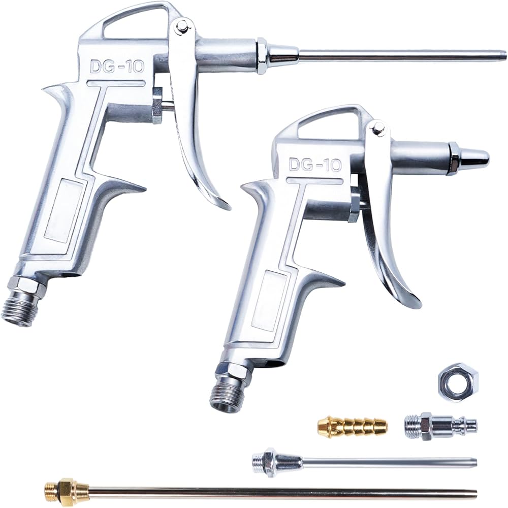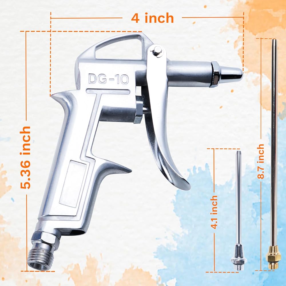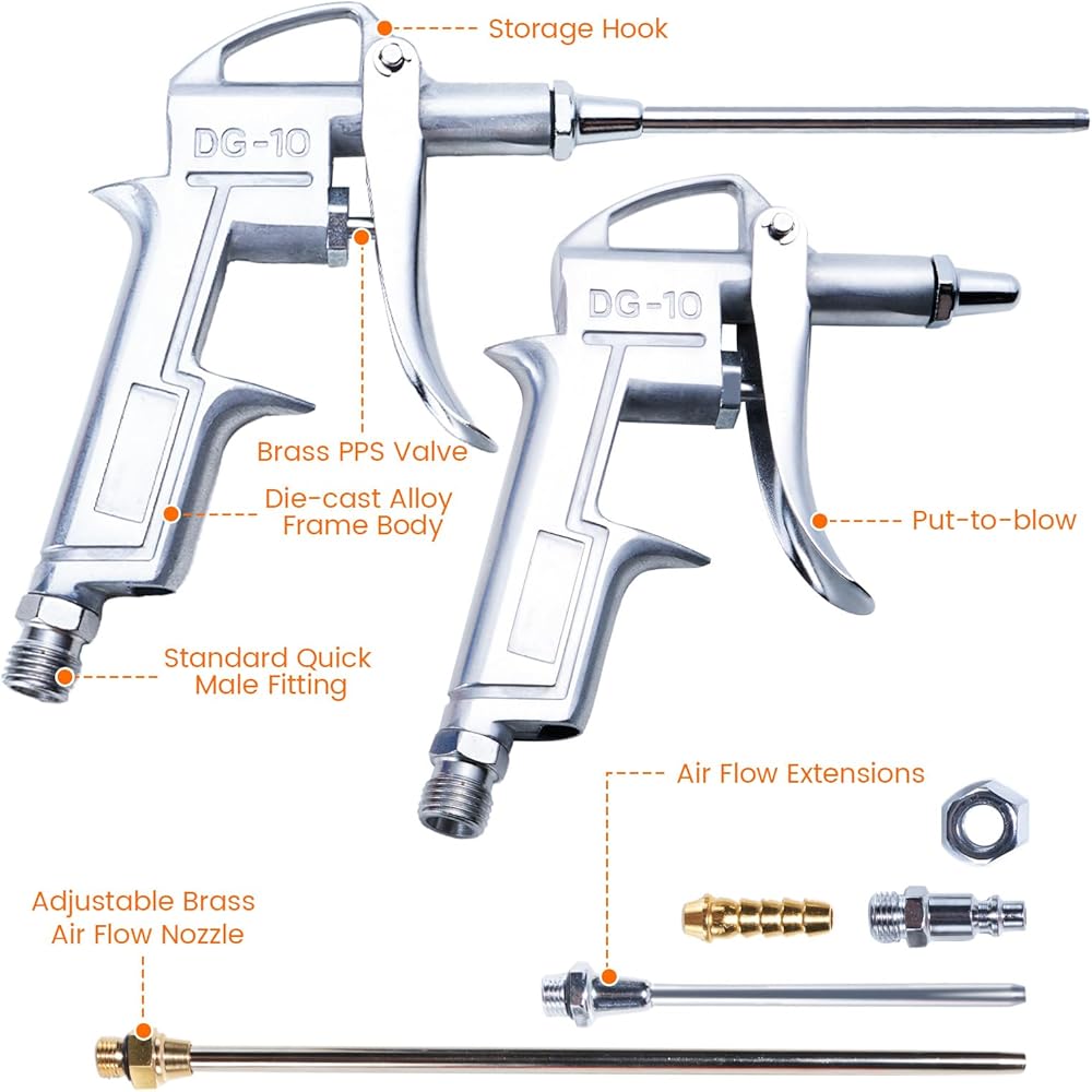 أدوات وملحقات تعمل بالهواء المضغوط: سوف تحصل على 1 × مسدس نفخ مع توصيل سريع قياسي، 1 × فوهة قصيرة لتدفق الهواء قابلة للتعديل، 2 × أنابيب تمديد لتدفق الهواء من الفولاذ.