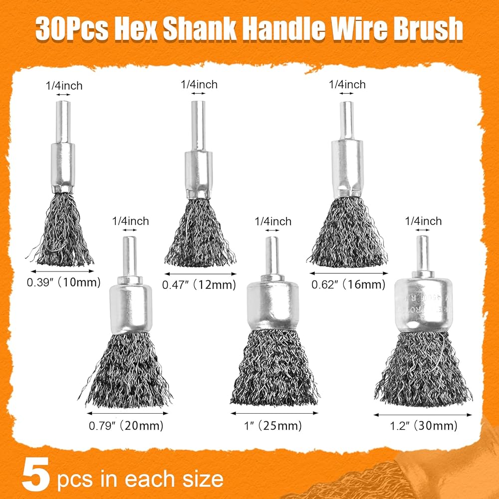 • مجموعة فرش سلك المثقاب: سوف تحصل على 30 قطعة من ملحقات مثقاب الفرشاة، بأحجام وأنواع مختلفة من الفرش تمكنك من تغطية احتياجاتك الأكثر في مشروع منزلي. تتضمن فرشاة نهاية سلكية 0.39 بوصة، 0.47 بوصة، 0.62 بوصة، 0.79 بوصة، 1 بوصة، 1.2 بوصة، 5 قطع في كل مقاس.