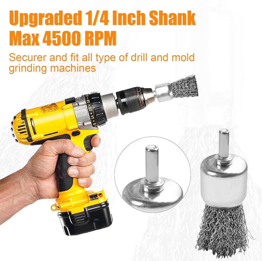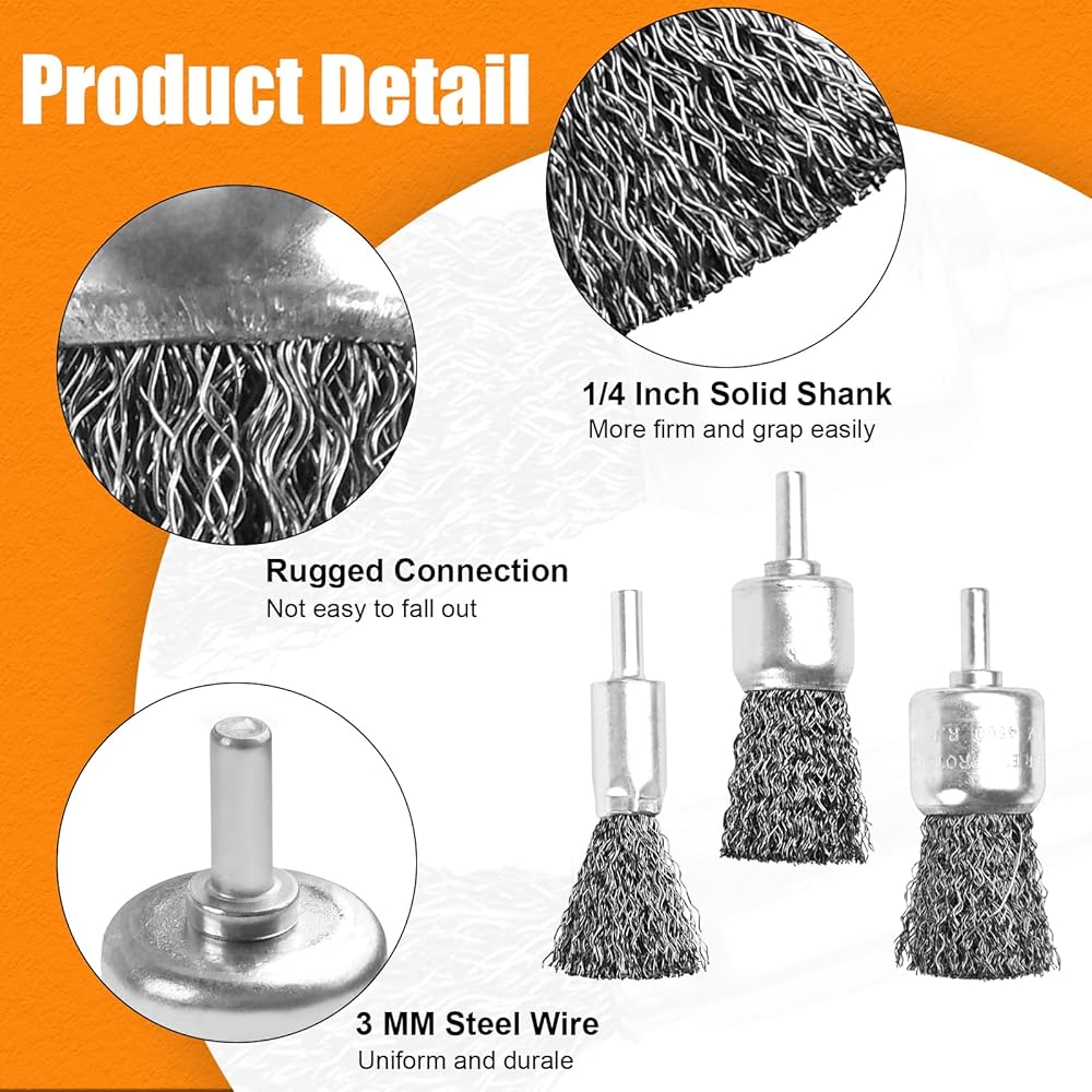 • عجلة سلكية قوية وفعالة: فرش سلك الحفر مملوءة جيدًا بأسلاك فولاذية كربونية مجعدة وغير مقوية مقاس 0.012 بوصة، والتي يتم تثبيتها بشكل آمن على حامل معدني على شكل كوب مصمم بشكل آمن والذي لن يفقد أو ينحني أثناء الاستخدام المكثف ويعمل بسلاسة أكبر. .