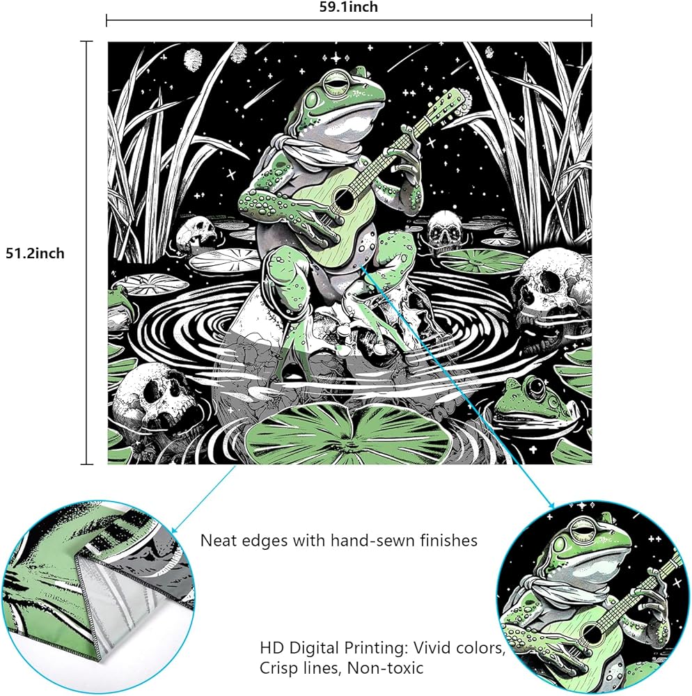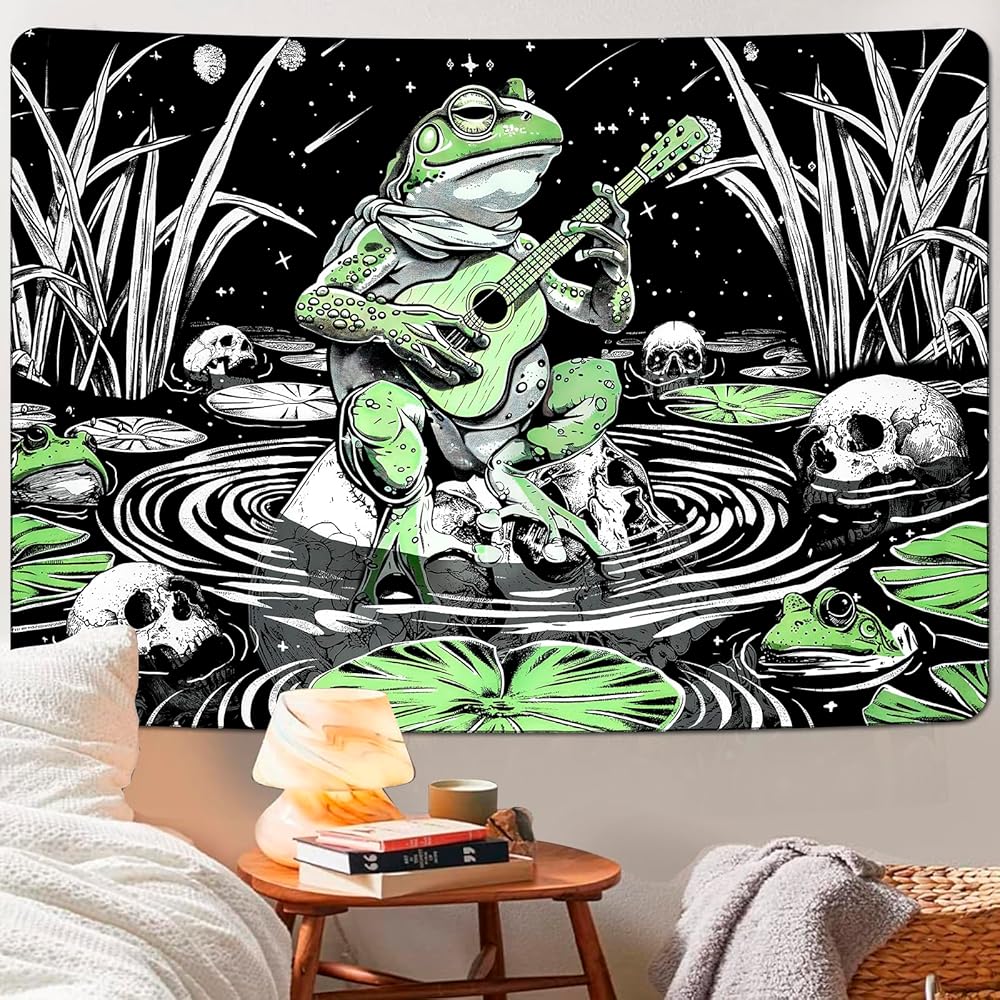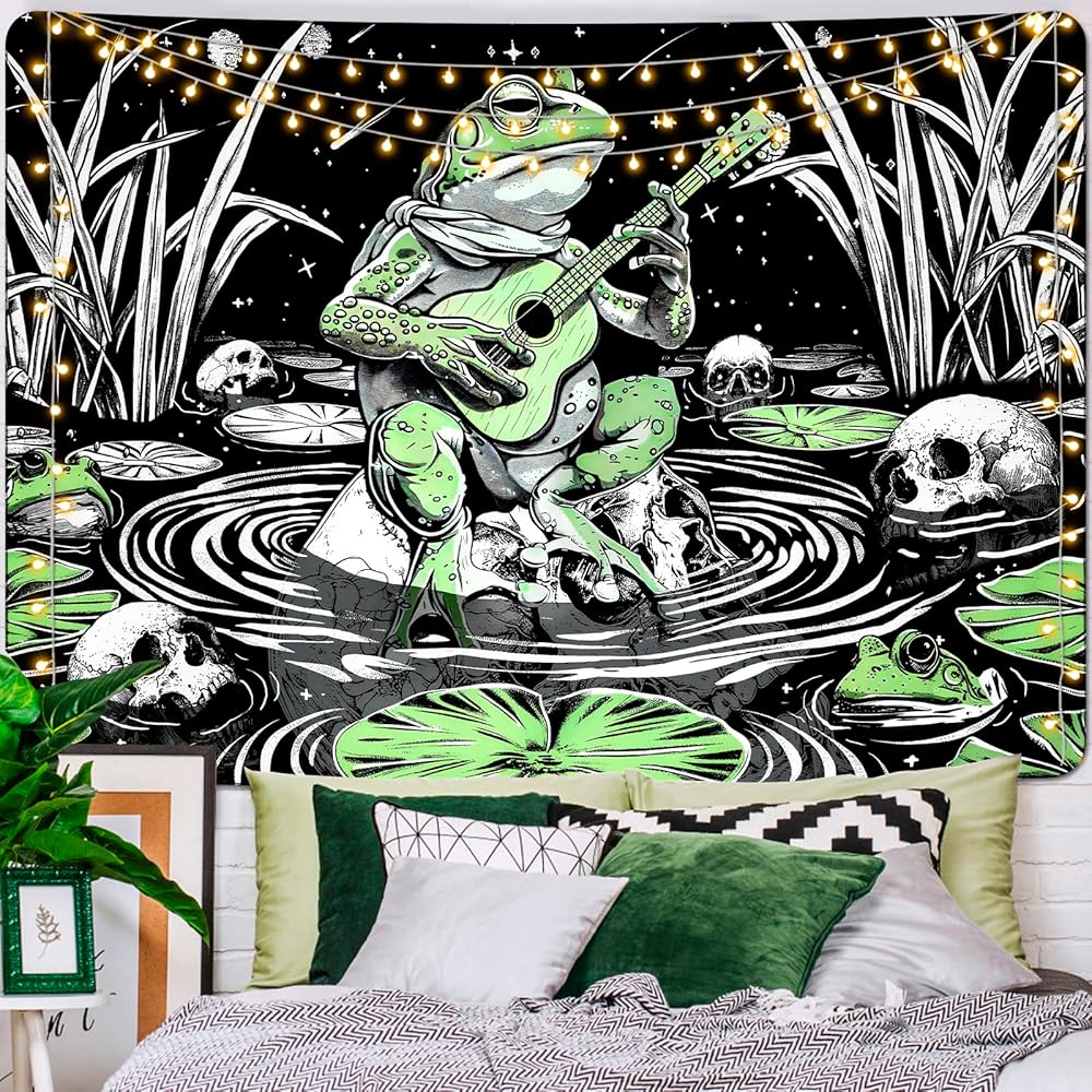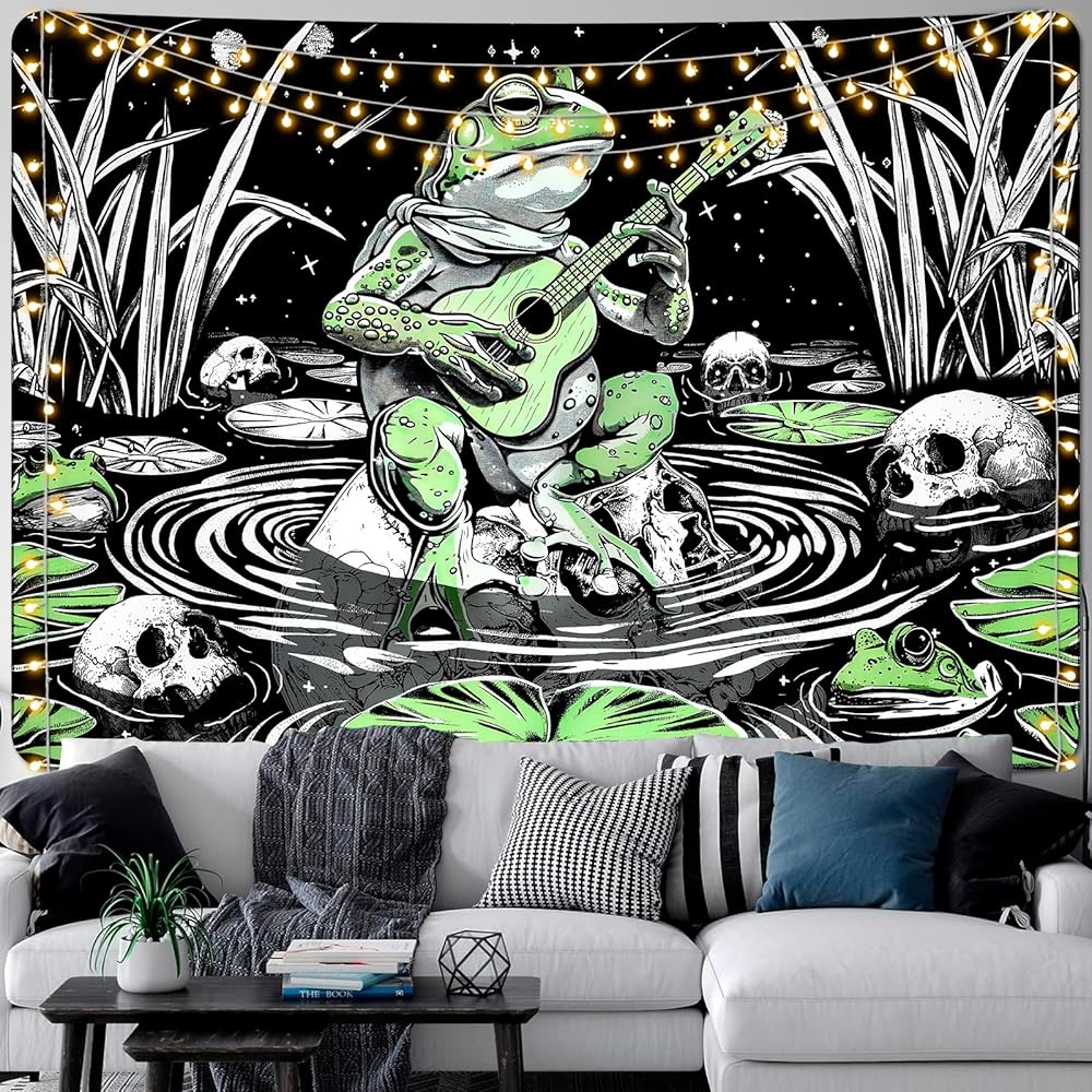 تصميم فريد: ضفدع يجلس على جيتار جمجمة، الصورة بأكملها فريدة ومثيرة للاهتمام، وسيضيف نسيج جمجمة هيبي المرح والرائع إلى أي مساحة. ديكور مثالي لغرفة الضفدع.