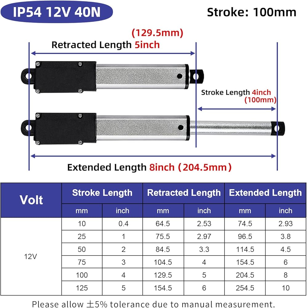 【المواصفات】: طول شوط المحرك الخطي الكهربائي 12 فولت = 100 مم (4 بوصة)؛ الطول المسحوب = 129.5 مم (5 بوصة)؛ الطول الممتد = 204.5 مم (8 بوصة)؛ سرعة السفر = 0.6 بوصة/ثانية (15 مم/ثانية)؛ الحد الأقصى للسحب الحالي = 2.5 أمبير؛ الحد الأقصى للحمل = 27 رطل (120 نيوتن).