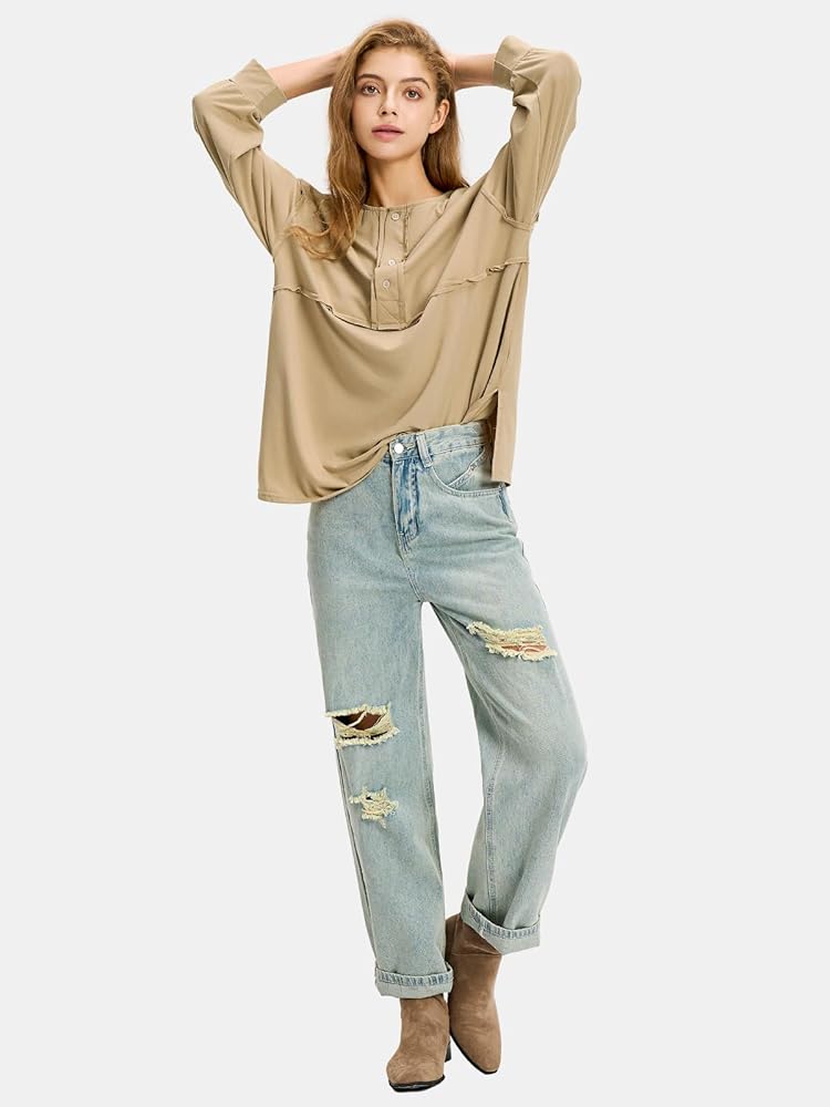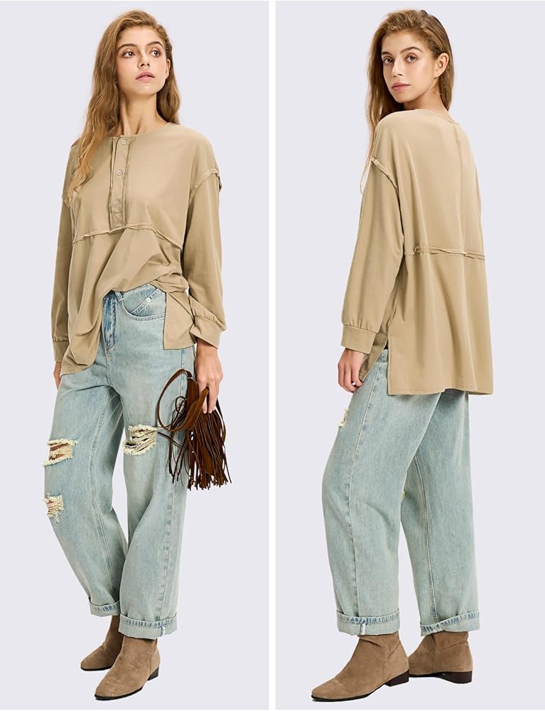 • المزايا: تي شيرتات كبيرة الحجم للسيدات، تصميم كلاسيكي بأزرار سفلية على شكل حرف V، قمصان بأكمام طويلة، قمصان برقبة على شكل حرف V للسيدات، بلوفر فضفاض، قمصان هينلي، قميص بفتحة جانبية، تي شيرت لطيف، نمط كاجوال، يعطي لك نظرة مريحة وأنيقة. يضيف التصميم المرقع الصلب عنصرًا فريدًا وعصريًا، مما يجعل هذا الجزء العلوي متميزًا عن الباقي