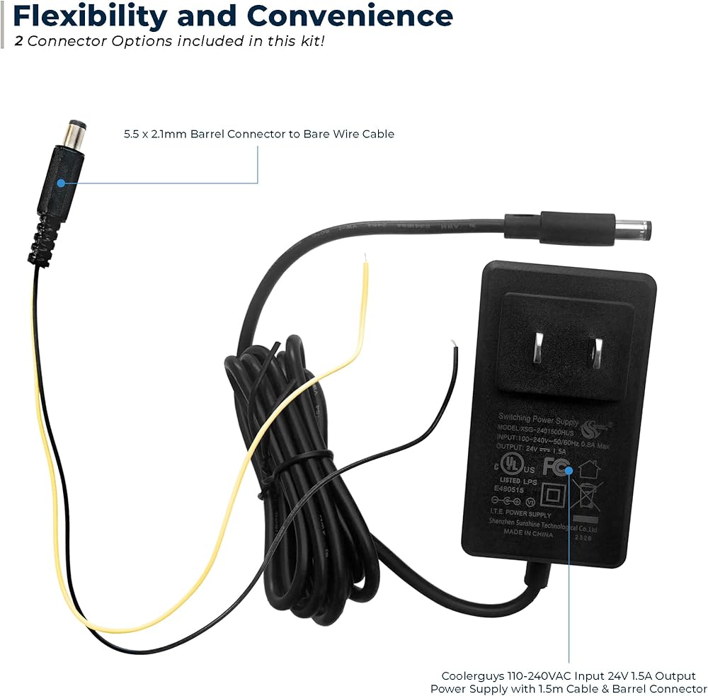 خيار الاتصال البديل: بخلاف مصدر طاقة الإخراج Coolerguys 110-240VAC 24V 1.5A، يوفر الموصل الأسطواني 5.5 × 2.1 مم إلى كابل السلك العاري المتضمن في هذه المجموعة طريقة اتصال بديلة، مما يسمح للمستخدمين باختيار الخيار الأنسب إعدادهم المحدد.