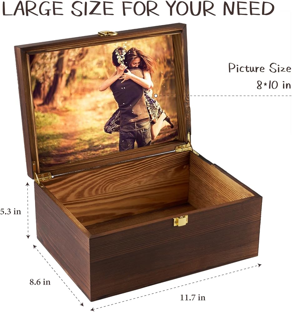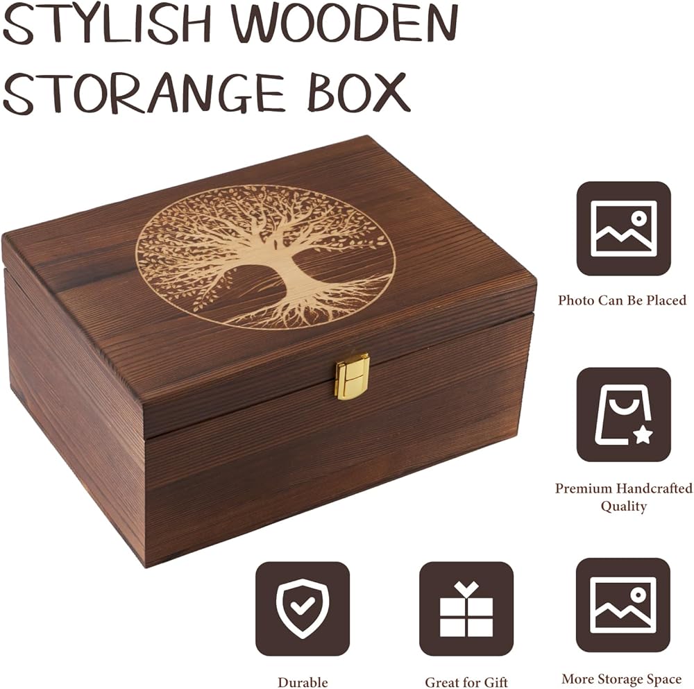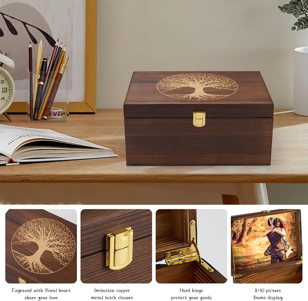 صناديق تذكار خشبية كبيرة من شجرة الحياة مع أغطية مفصلية وإطار صورة داخل الغطاء - صندوق تخزين مزخرف مع أغطية مفصلية لكبسولة زمنية لحرف الصورة - 5.3 بوصة * 8.6 بوصة * 11.7 بوصة