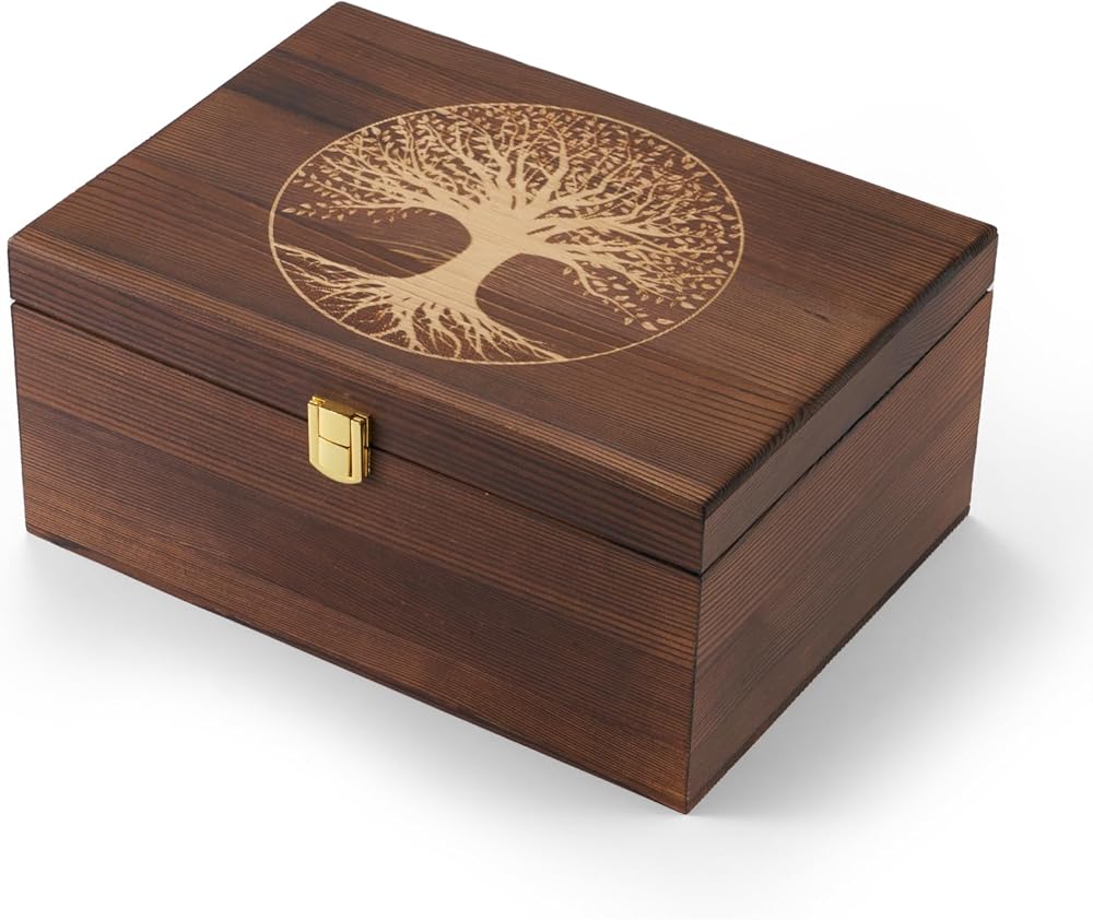 • متعدد الاستخدامات وأنيق - صندوق تذكار مثالي للصور نقدم صندوق التذكار الأصلي المصمم بشكل رائع، والذي يتميز بشجرة الحياة المستديرة الفريدة من نوعها المحفورة بالليزر والتي تضيف لمسة من الأناقة إلى ذكرياتك العزيزة. بأبعاد 5.3 × 8.6 × 11.7 بوصة، يعد هذا الصندوق متعدد الاستخدامات مثاليًا لتخزين وعرض صورك الثمينة.