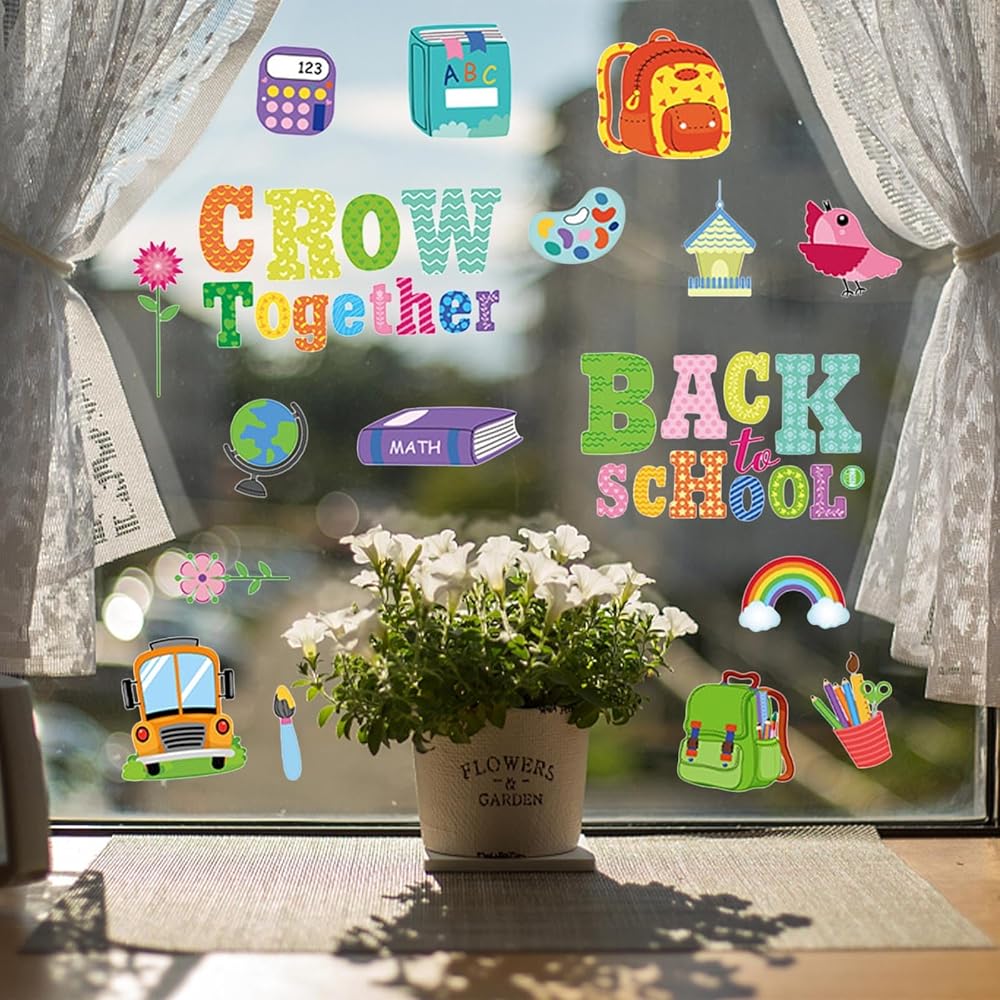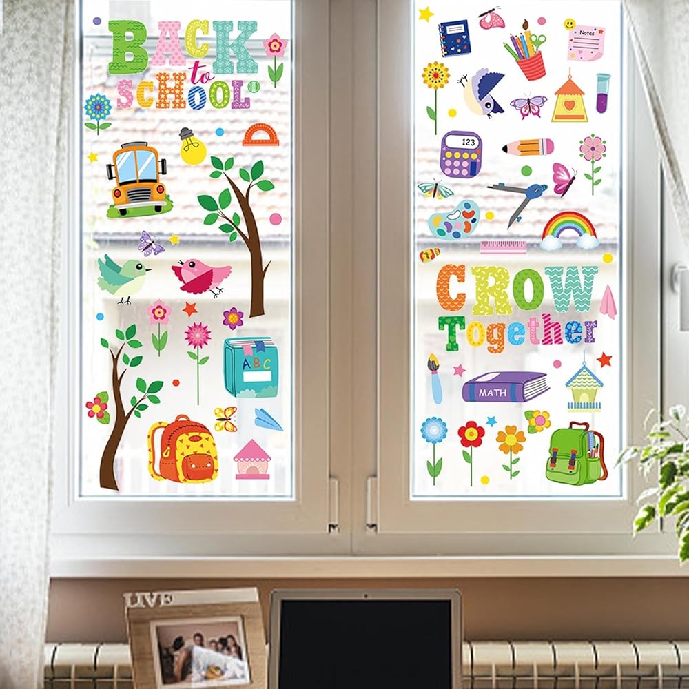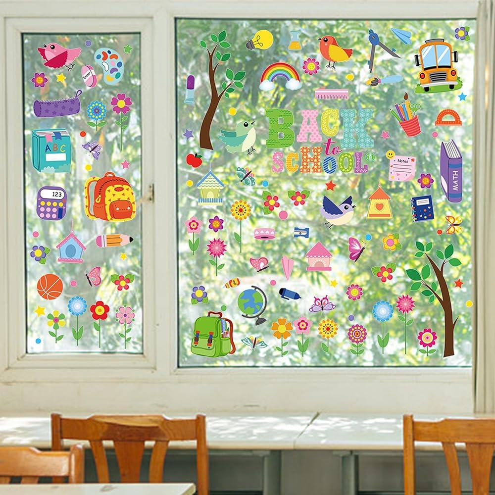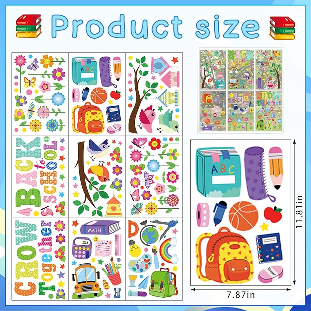 • 【التصميم】ملصقات نافذة لحفلات العودة إلى المدرسة عصرية وفريدة من نوعها. تصميم بنمط مدرسي مزدوج الجوانب مثل الأدوات المدرسية، والزهور، والطيور، والحافلة المدرسية، و9 أوراق. مثالية لتزيين الفصول المدرسية.