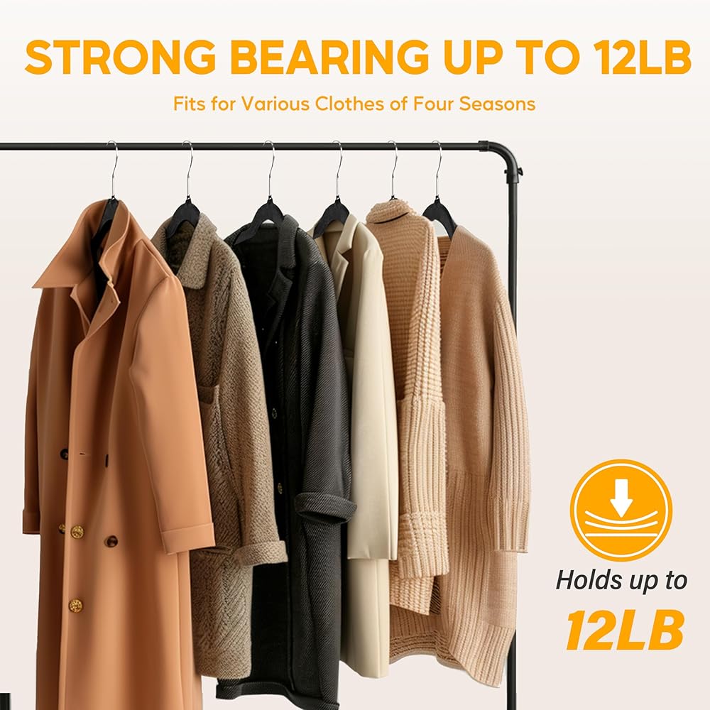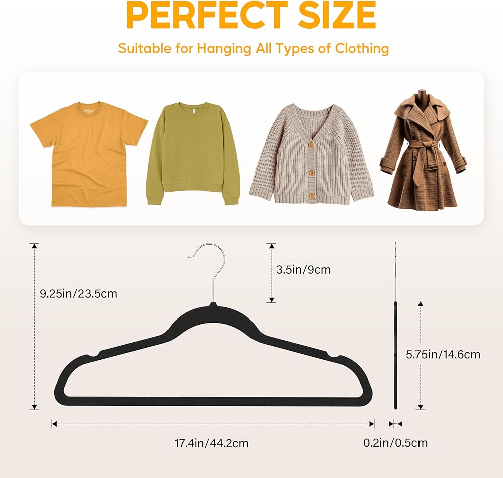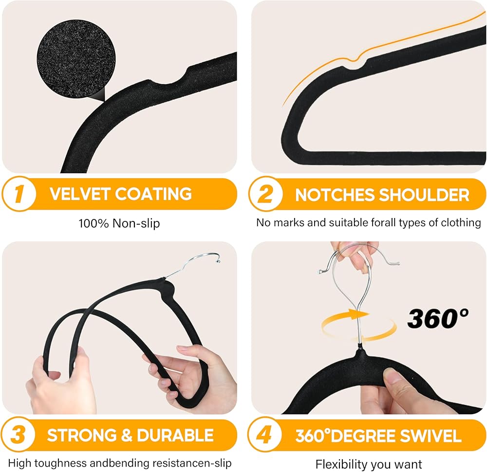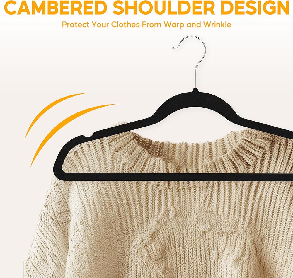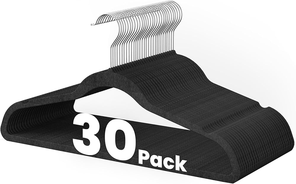 متينة وقوية: هذه الشماعات المخملية السوداء المكونة من 30 قطعة مصنوعة من بلاستيك ABS قوي ومتين. يمكن لكل علاقة ملابس أن تحمل ما يصل إلى 12 رطلاً (5.5 كجم)، مما يجعلها مثالية لتعليق السترات الثقيلة والسترات والملابس الثقيلة الأخرى بسهولة.