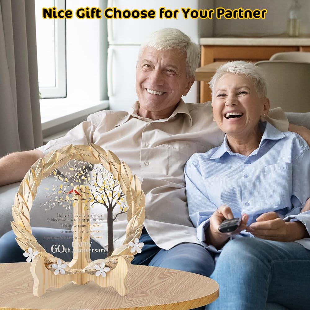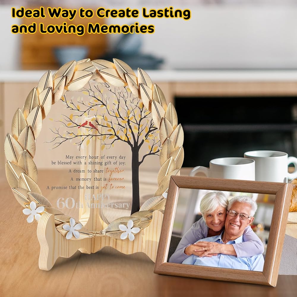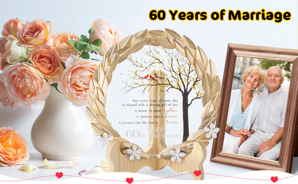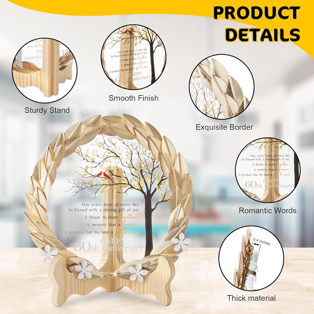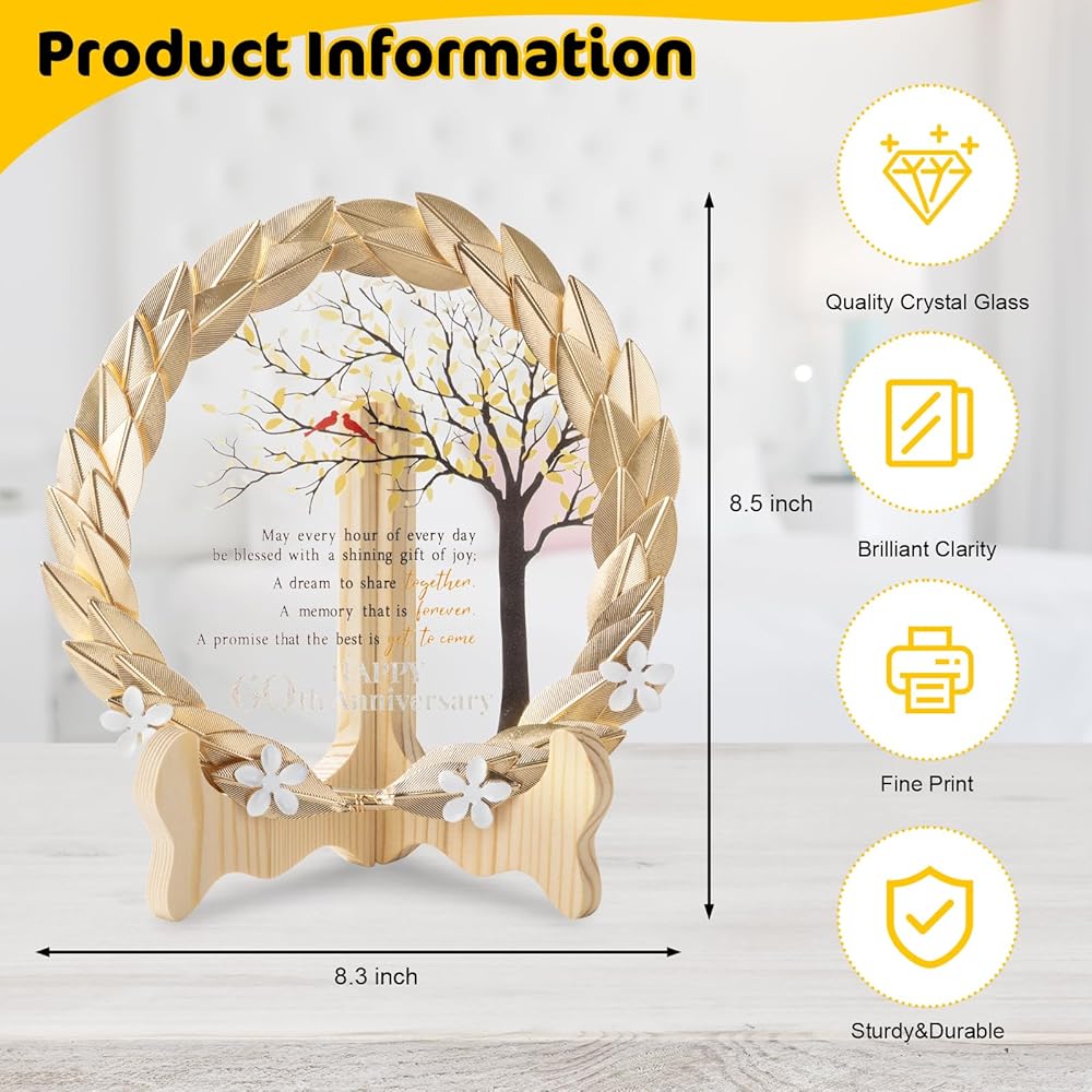حرفية رائعة - تم تصميم إكليلنا المعدني المذهّب بدقة وحرفية رائعة، ويغطي لوحة كريستالية. يعرض القرص البلوري بأناقة رسالة صادقة، ترمز إلى الرابطة الدائمة التي دامت 60 عامًا معًا.