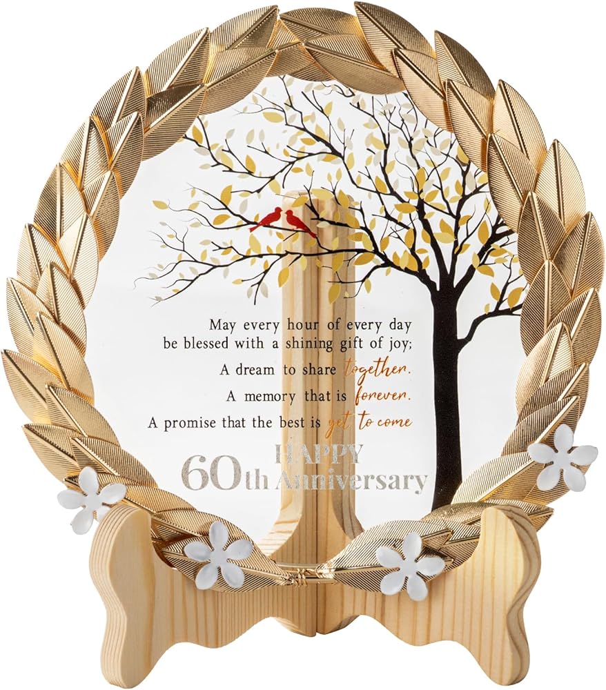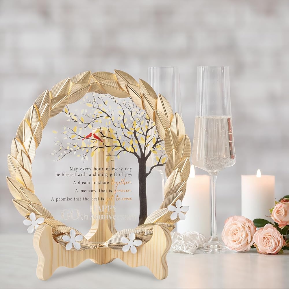 هدية تذكارية فريدة من نوعها للذكرى الستين - احتفل بمرور 60 عامًا على الزواج من خلال إكليلنا المعدني الذهبي الفريد ولوحة الكريستال. هذه الهدية الاستثنائية مثالية للاحتفال بالذكرى الستين التي لا تُنسى.