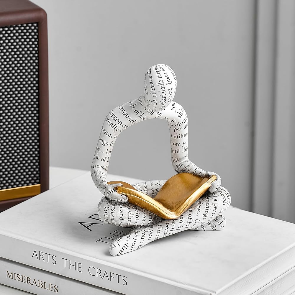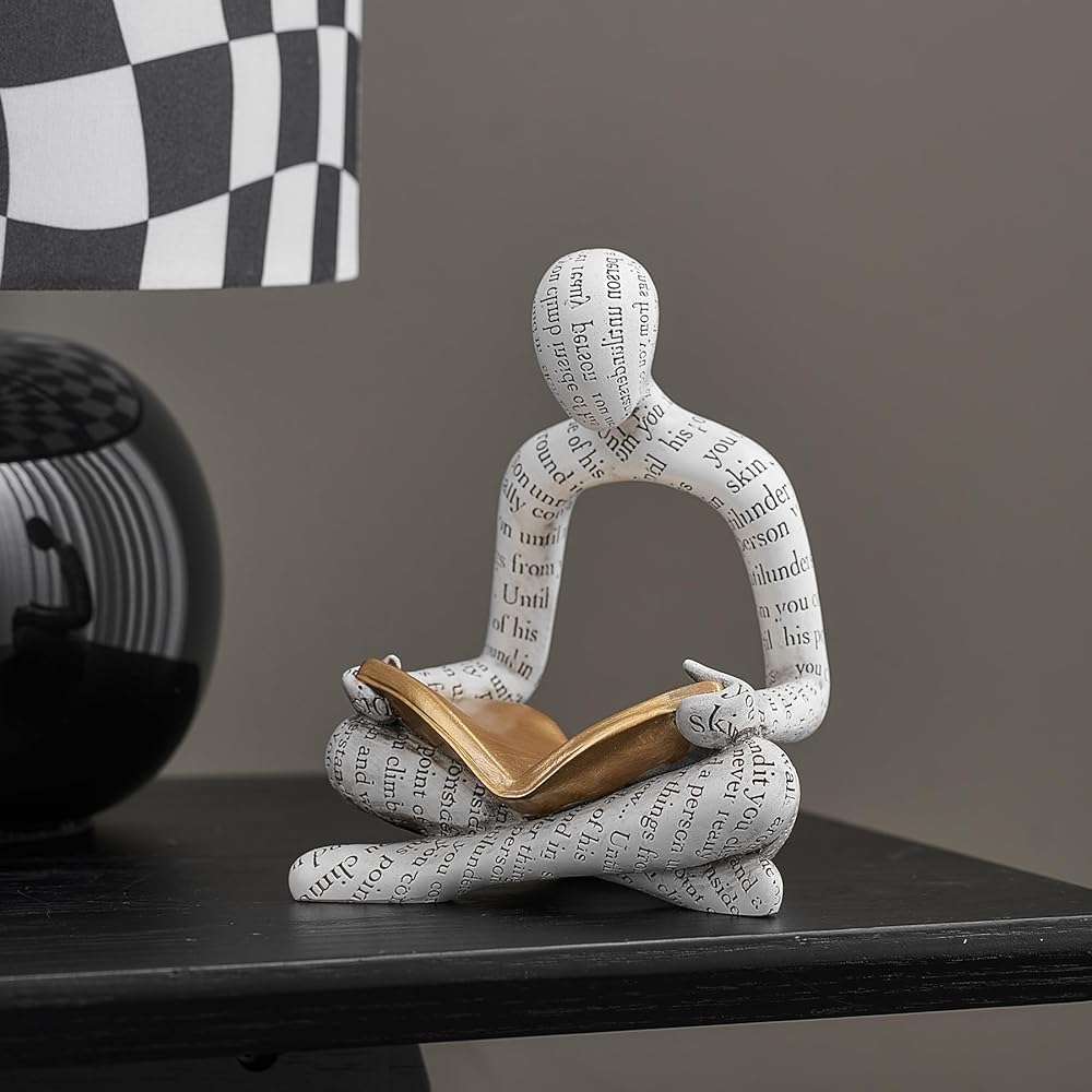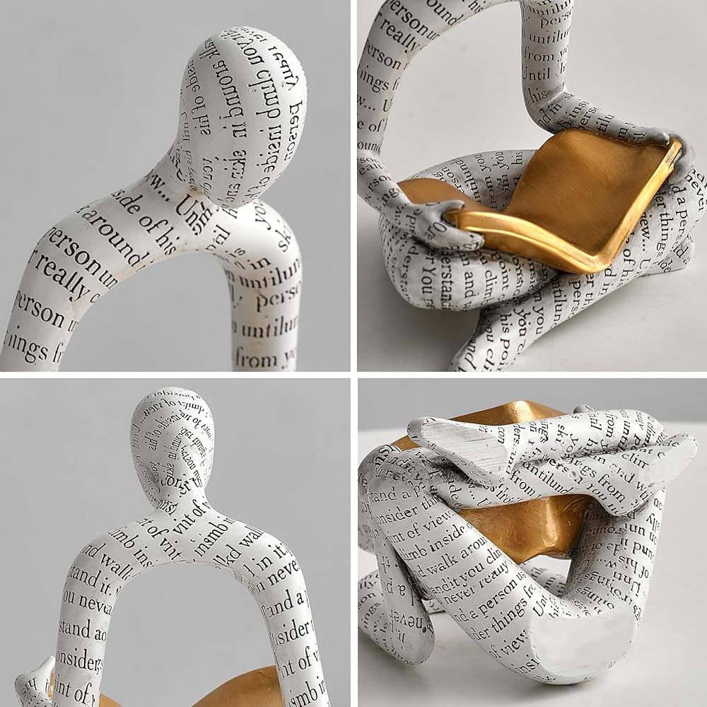 Introducing our vintage-inspired Abstract Thinker Statue, a captivating piece of art that will add a touch of sophistication and intellectual charm to your home decor. Crafted from high-quality resin with a lustrous gold finish, this exquisite sculpture is meticulously designed to embody the essence of deep contemplation and understanding. Standing at a height of [measurement], our Thinker Statue exudes timeless elegance, making it a perfect addition to your living room, bookshelf, desk, table, or office. Its sleek and modern design effortlessly blends with any decor style, be it modern or rustic, adding a unique and collectible touch to your space. This beautifully crafted figurine depicts a refined thinker absorbed in reading a book. The meticulously sculpted details, from the carefully placed creases of his flowing robe to the intricate facial features, showcase the talent and artistry behind this creation. The golden finish adds a touch of opulence and allure, enhancing the overall aesthetic appeal of this masterpiece. Whether you place it as a centerpiece on your mantel or as a focal point on your TV stand, our Thinker Statue will undoubtedly become a conversation starter, capturing the attention and admiration of your guests. Its versatile size allows for easy placement, enabling you to effortlessly enhance any corner of your home. Ideal as a housewarming gift or a present for art enthusiasts, this thinker statue is truly one-of-a-kind. Its presence will not only elevate the visual appeal of your home but also inspire deep thought and contemplation. It serves as a reminder to embrace knowledge, wander through the realms of imagination, and perpetually seek understanding in our fast-paced lives. The durability and quality of the materials used ensure that this Thinker Statue will stand the test of time. Its sturdy build guarantees resilience, ensuring that you can enjoy its alluring presence for years to come. Enhance your home decor with this captivating Abstract Thinker Statue. With its combination of vintage charm, abstract artistry, and meaningful symbolism, it will undoubtedly become a cherished piece of art in your collection. So, bring home this unique and timeless sculpture, embrace the beauty of deep thought, and allow it to radiate a sense of sophistication and intellect throughout your living space.