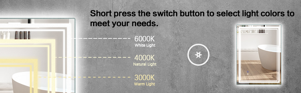 مرآة حمام LED مع إضاءة خافتة: تحتوي مرآة Vanity LED على ثلاثة ألوان فاتحة للاختيار مجانًا. يمكنك التبديل بين الألوان الفاتحة وضبط السطوع وفقًا لتشغيل الدليل. يمكنه تخزين اللون الأخير والسطوع