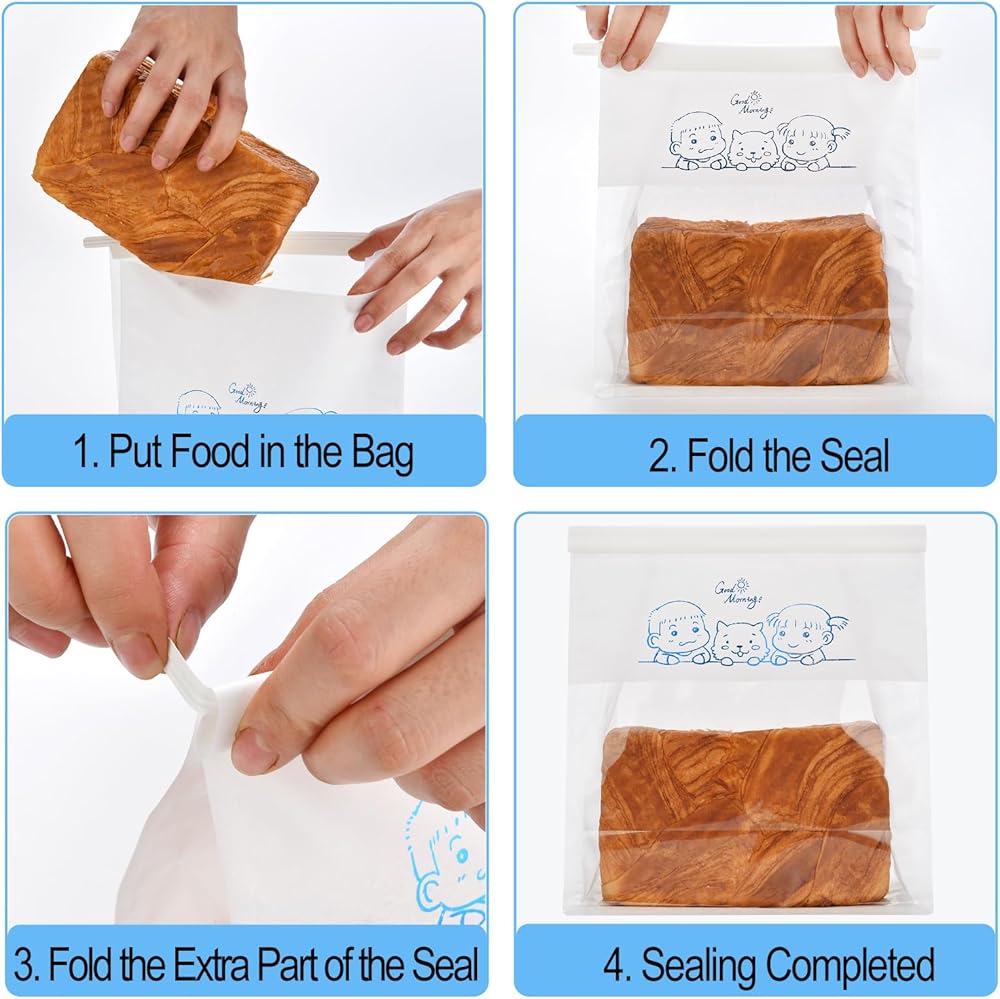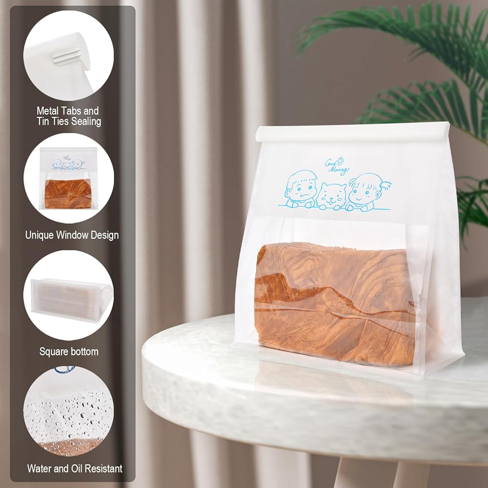 قابلة لإعادة الاستخدام وآمنة: أكياس الخبز لدينا مجهزة بعروات معدنية وروابط من القصدير يمكن فتحها وإغلاقها بشكل متكرر. يوفر هذا إغلاقًا قويًا مقاومًا للغبار والرطوبة، مما يحافظ على طعامك طازجًا ولذيذًا لفترة أطول.