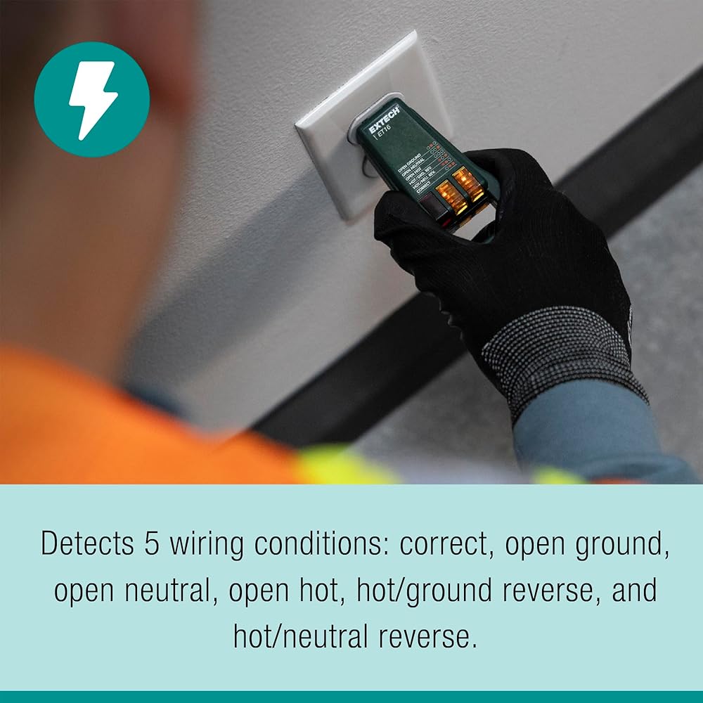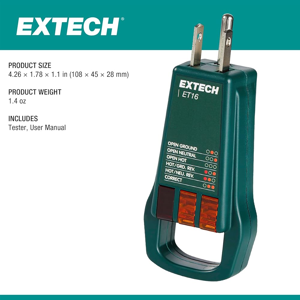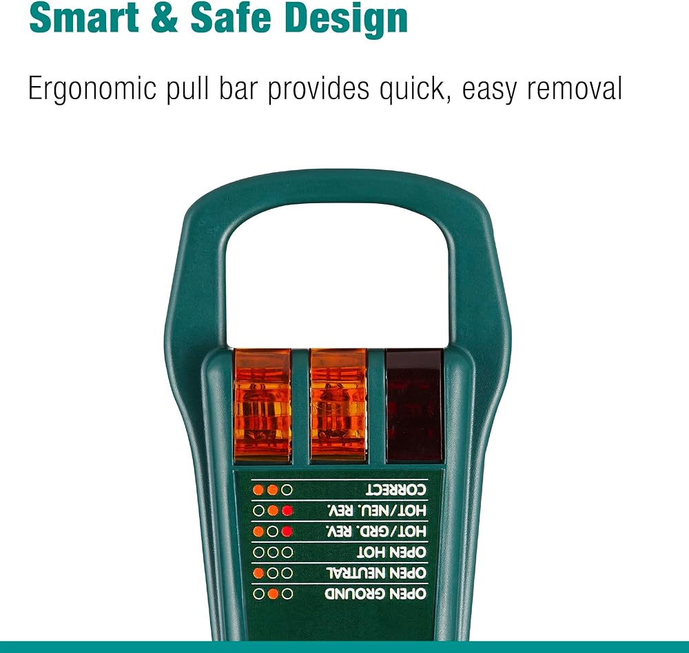 - Detects 5 wiring faults: Correct, Open Ground, Open Neutral, Open Hot, Hot/Ground Reverse, and Hot/Neutral Reverse