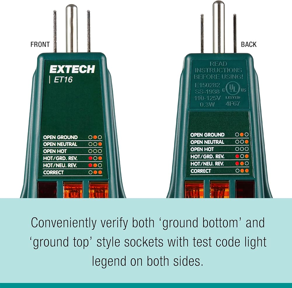 - Conveniently verify both ‘ground bottom' and ‘ground top' style sockets with test code light legend on both sides