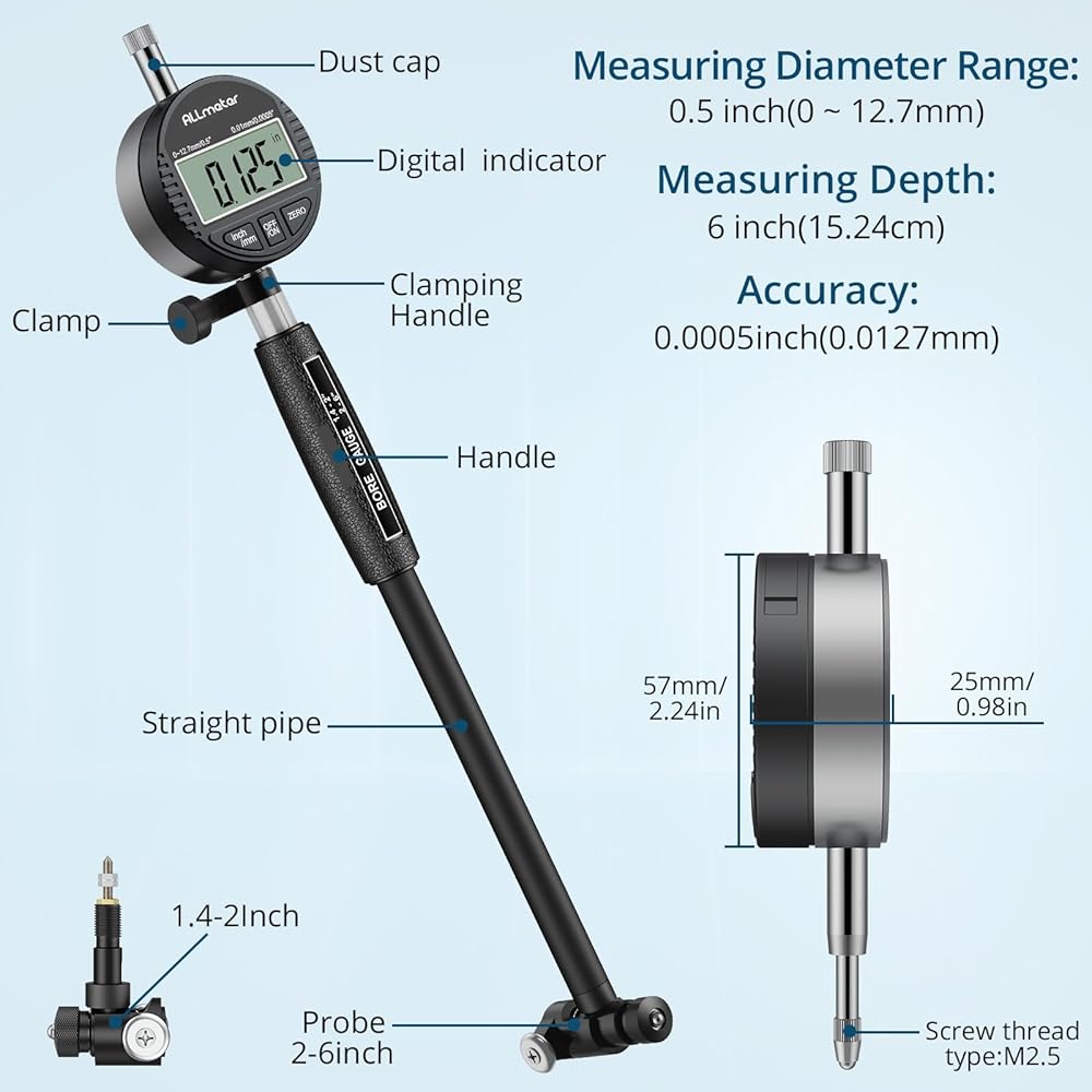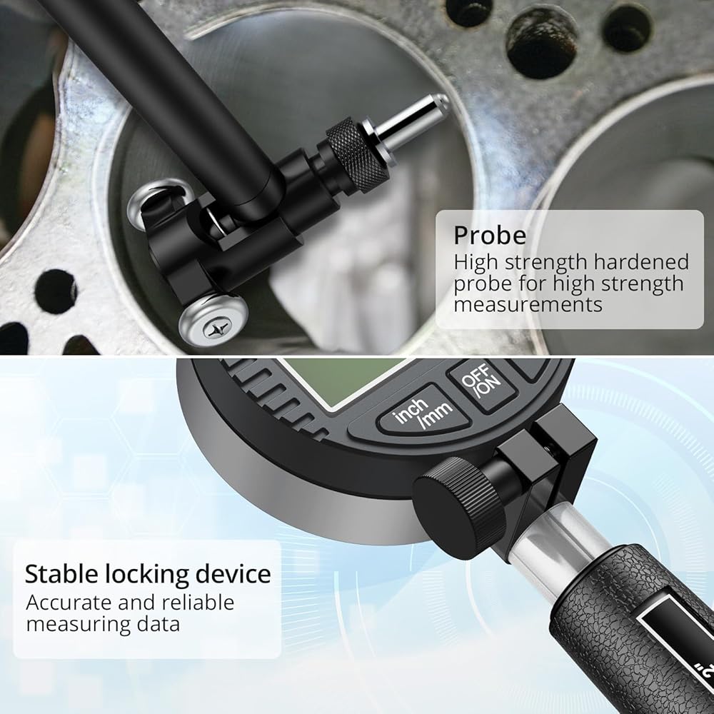 قياس الفتحة العميقة عالي الدقة: يمكن لمقياس تجويف القرص هذا قياس فتحات الأسطوانة بأقطار تتراوح من 2 إلى 6 بوصات، بدقة 0.001 بوصة، وهو مثالي للقياس الدقيق للتجويف العميق والمعقد.