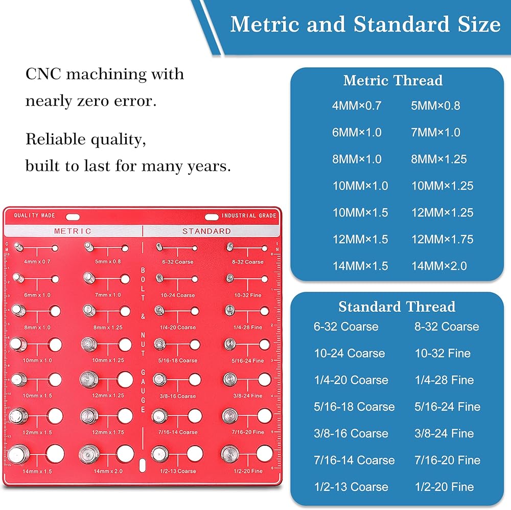 تغطية شاملة - مجهز بـ 28 مقاسًا مختلفًا من الصواميل والمسامير، يتضمن جهاز فحص الصواميل والمسامير هذا 14 مقاسًا متريًا يتراوح من M4 × 0.7 إلى M14 × 2.0، و14 مقاسًا قياسيًا من 6-32 خشنًا إلى 1/2 -20 ناعمًا. إنها أداة متعددة الاستخدامات لتحديد مجموعة واسعة من أحجام الصواميل والمسامير، مما يجعلها إضافة أساسية لأي ورشة عمل احترافية أو منزلية.