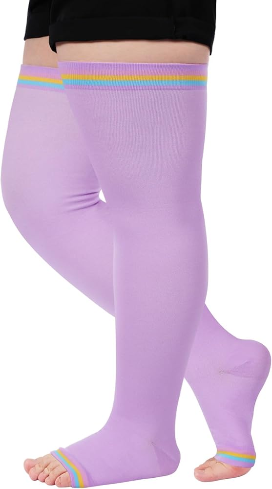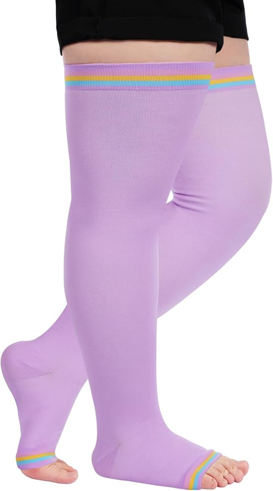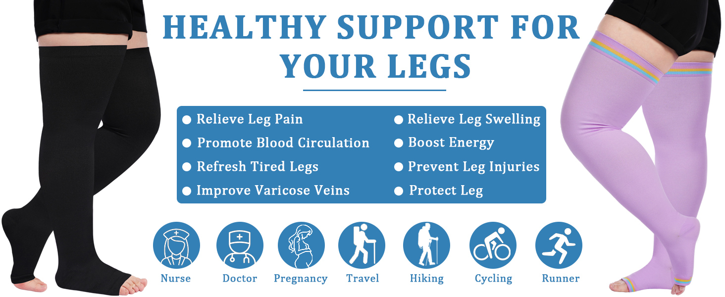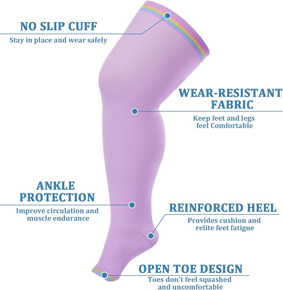 • مادة مسامية وتصميم مفتوح عند الأصابع: هذه الجوارب الضاغطة المفتوحة عند الأصابع مصنوعة من النايلون المتين ومادة سباندكس، مناسبة للارتداء طوال اليوم. توفر هذه الجوارب عالية الضغط للفخذ مرونة أكبر ومساحة قابلة للتعديل، مما يسمح لقدميك بالتنفس بحرية. وبدون أي خدش أو تهيج أثناء ارتداء الجوارب الضاغطة ذات الحجم الكبير.