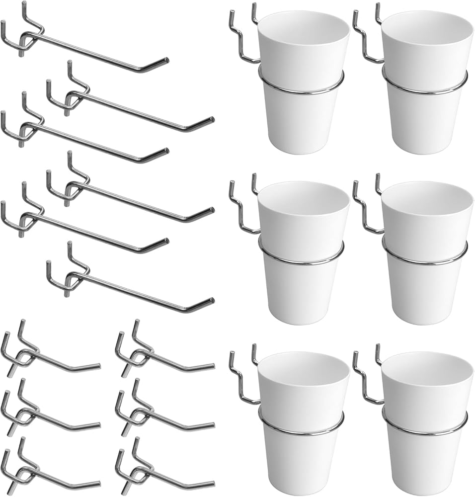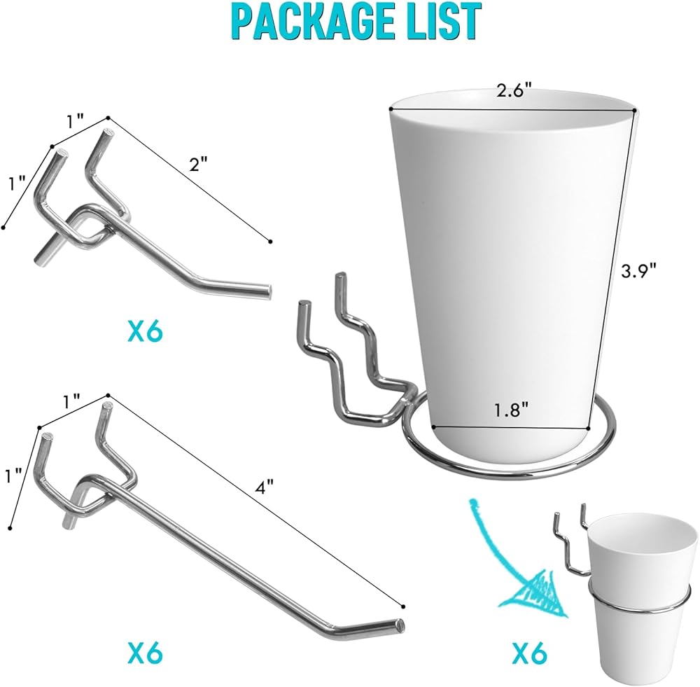 • مجموعة متنوعة من Pegboard - تتضمن 6 قطع من الخطافات المستقيمة مقاس 5.08 سم و10.16 سم، بالإضافة إلى 6 أكواب تعليق صغيرة. يمكن استخدام هذه الخطافات متعددة الاستخدامات كرفوف أو لتعليق أشياء متعددة أو فردية، مما يوفر مجموعة مرنة لتلبية احتياجاتك المتنوعة.