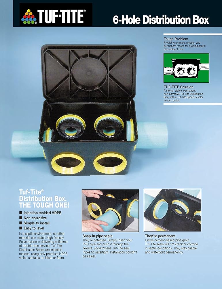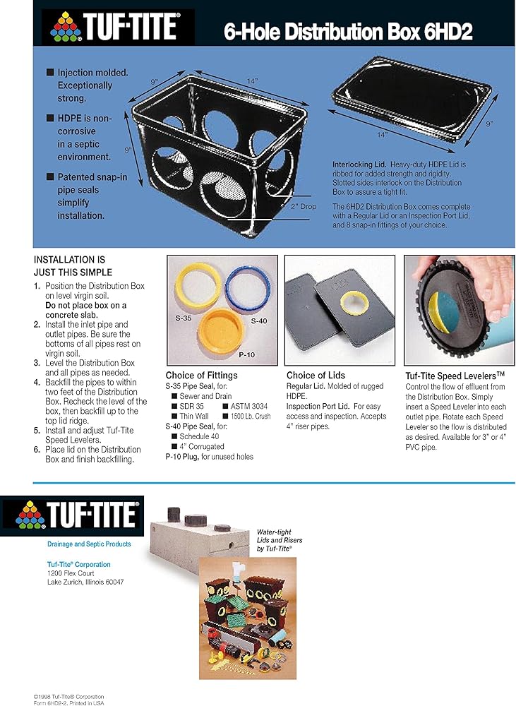 The Tuf-tite 6HD2 6-Hole Distribution Box comes complete with a lid. The Lid is 9" x 14"; Box is 9" tall. There is a 2" drop between inlet and outlet. Extra Fittings Sold Separately: B07RGRV8J6