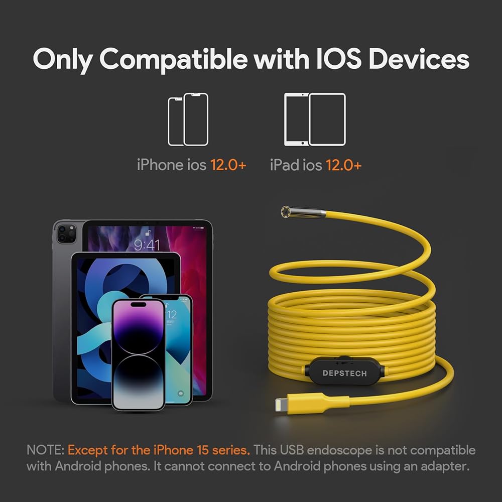توافق واسع ومتعدد الاستخدامات: مع مسبار نحيف 7 مم، تتنقل كاميرا الثعبان الخاصة بنا في المساحات الضيقة دون عناء، مما يوفر وصولاً لا مثيل له لعمليات الفحص. متوافق مع iOS 12.0+ iPhone وiPad (باستثناء سلسلة iPhone 15 مع واجهة من النوع c)، ما عليك سوى تنزيل تطبيق ""DEPSTECHCAM"" للاتصال السهل والبديهي. مثالية للمبتدئين والخبراء على حد سواء. (ملاحظة: لا يمكن توصيل منظار USB هذا بهاتف أندرويد باستخدام محول. فهو غير متوافق مع هاتف أندرويد.)
