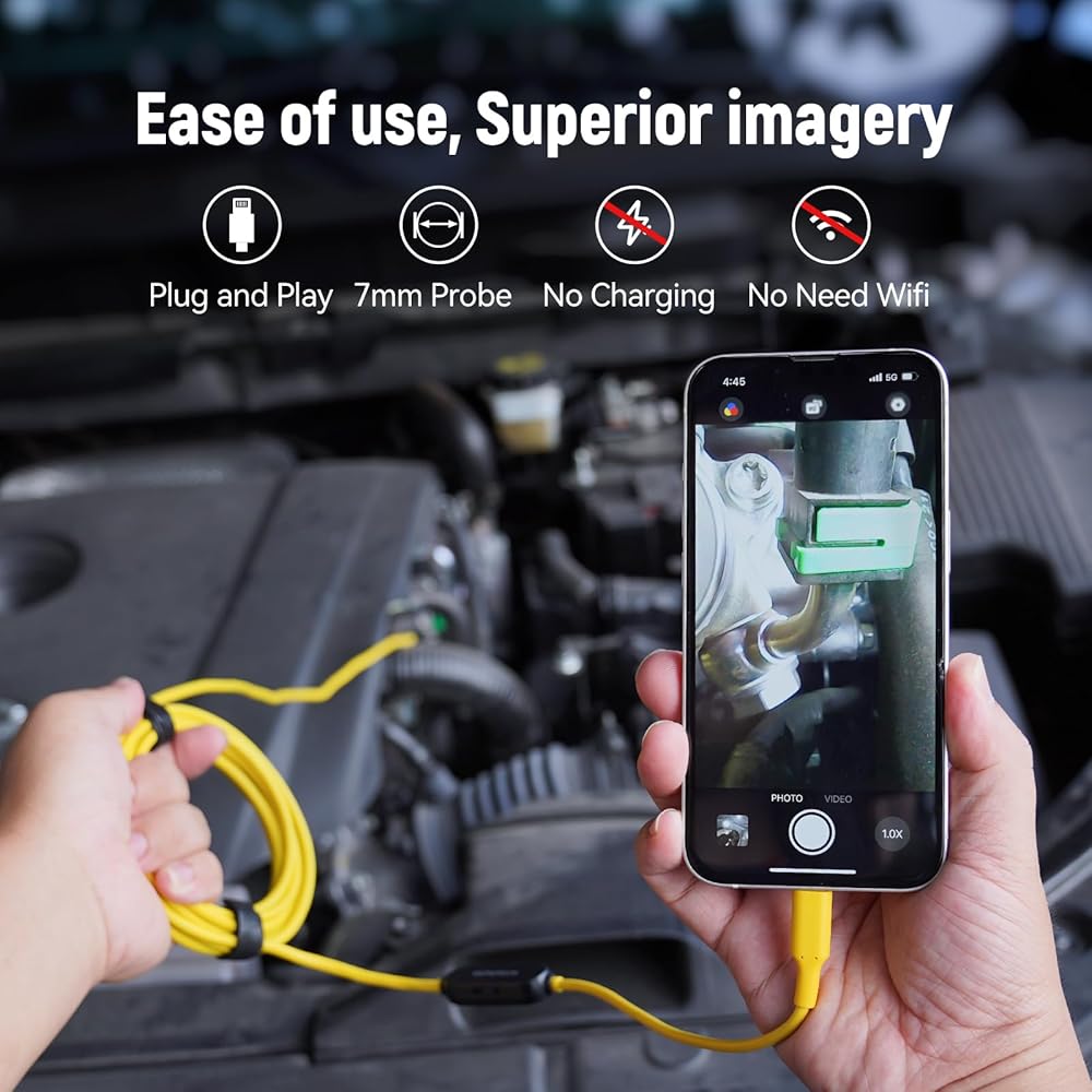 أداء سريع ومتين: مدعومًا بشريحة الجيل الخامس، توفر كاميرا المنظار هذه معالجة سريعة للغاية. يتميز بكابل شبه صلب بطول 16.4 قدم ومقاوم للماء IP67، ويمكنه تحمل الظروف الرطبة والبيئات القاسية، مما يجعله أداة لا غنى عنها للميكانيكيين والفنيين ومحترفي الأعمال اليدوية.