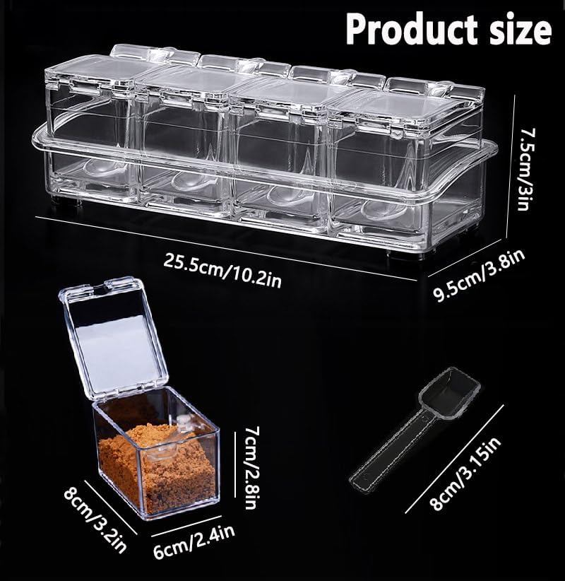مجموعة صناديق التوابل، 4 قطع من أواني التوابل الأكريليك الشفاف، حاويات بهارات مع غطاء وملعقة، حاوية تخزين رف التوابل، أدوات تنظيم الطبخ في المطبخ لإبريق الملح والسكر والتوابل